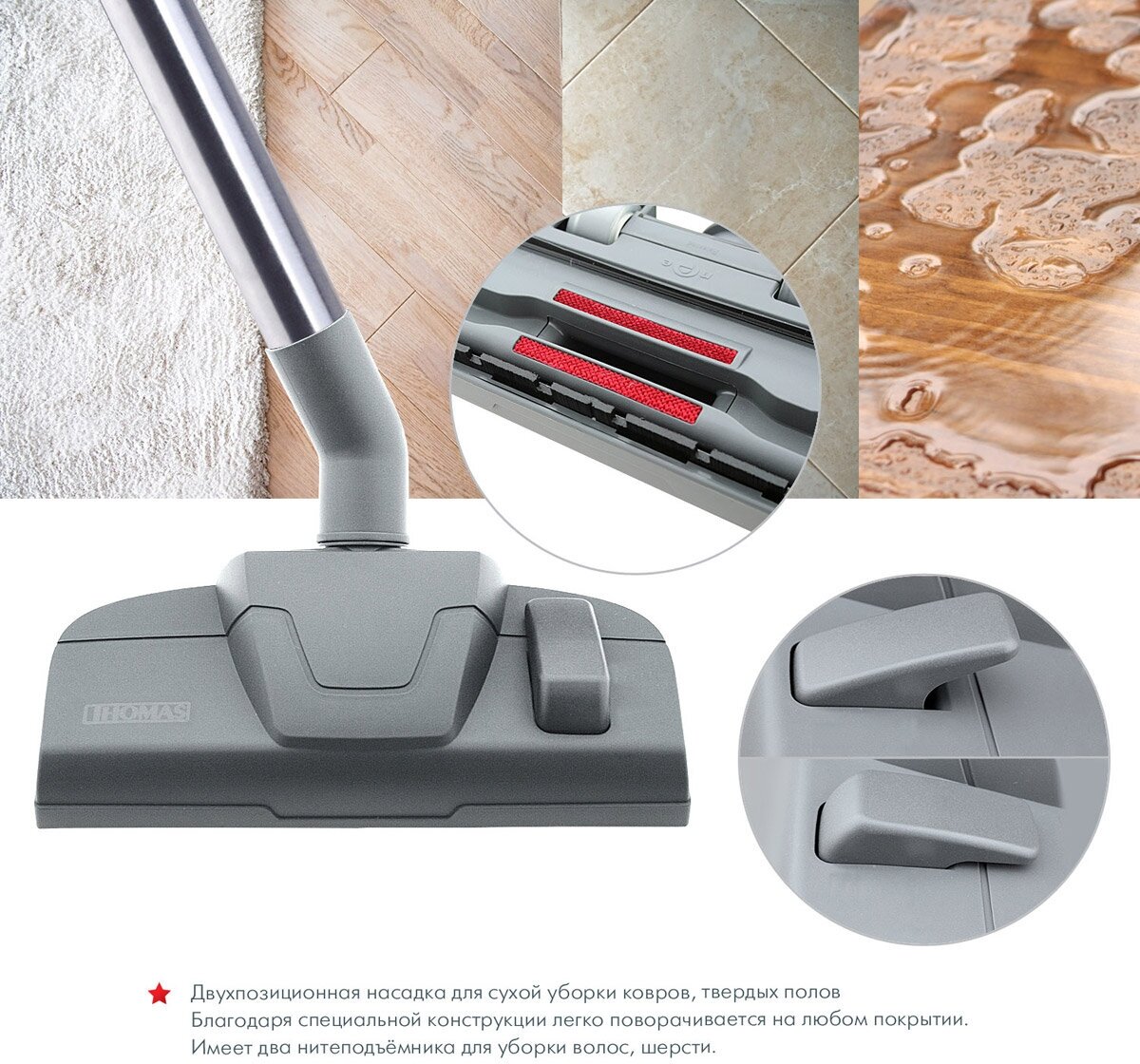 Моющий пылесос для качественной уборки полов и ковров с тремя режимами работы: сухая уборка с авафильтром Thomas, влажная уборка и сбор больших луж. Благодаря отсутствию мешков пылесос поддерживает постоянную мощность всасывания во время всей уборки. Поэтому мусор убирается с первого же прохода насадки. Заправочных объемов хватает на влажную уборку больших площадей без дозаправок. Вертикальная парковка облегчает хранение пылесоса.