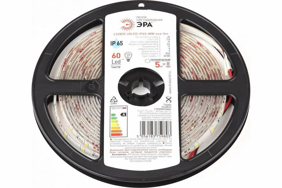 Светодиодная влагозащищенная лента ЭРА 48W/m 60LED/m 2835SMD теплый белый 5M LS2835-60LED-IP65-WW-eco-5m