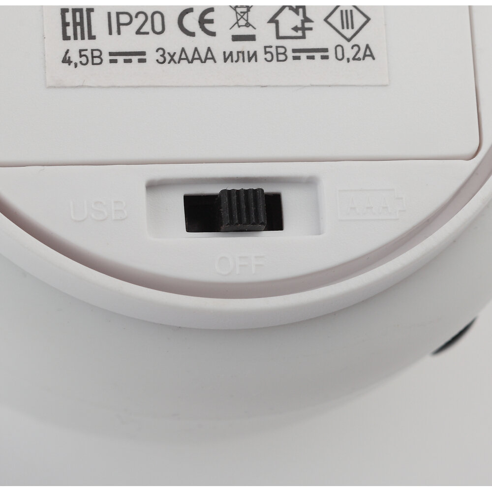 "Мягкий" материал. Работает от элементов 3 х ААА (не входят в комплект поставки) или от USB. USB кабель в комплекте. Выключатель для выбора типа питания и отключения/блокировки сенсора. 2 режима (переключение прикосновением): белый свет, RGB c переходами цветов. Дизайн в виде кита.