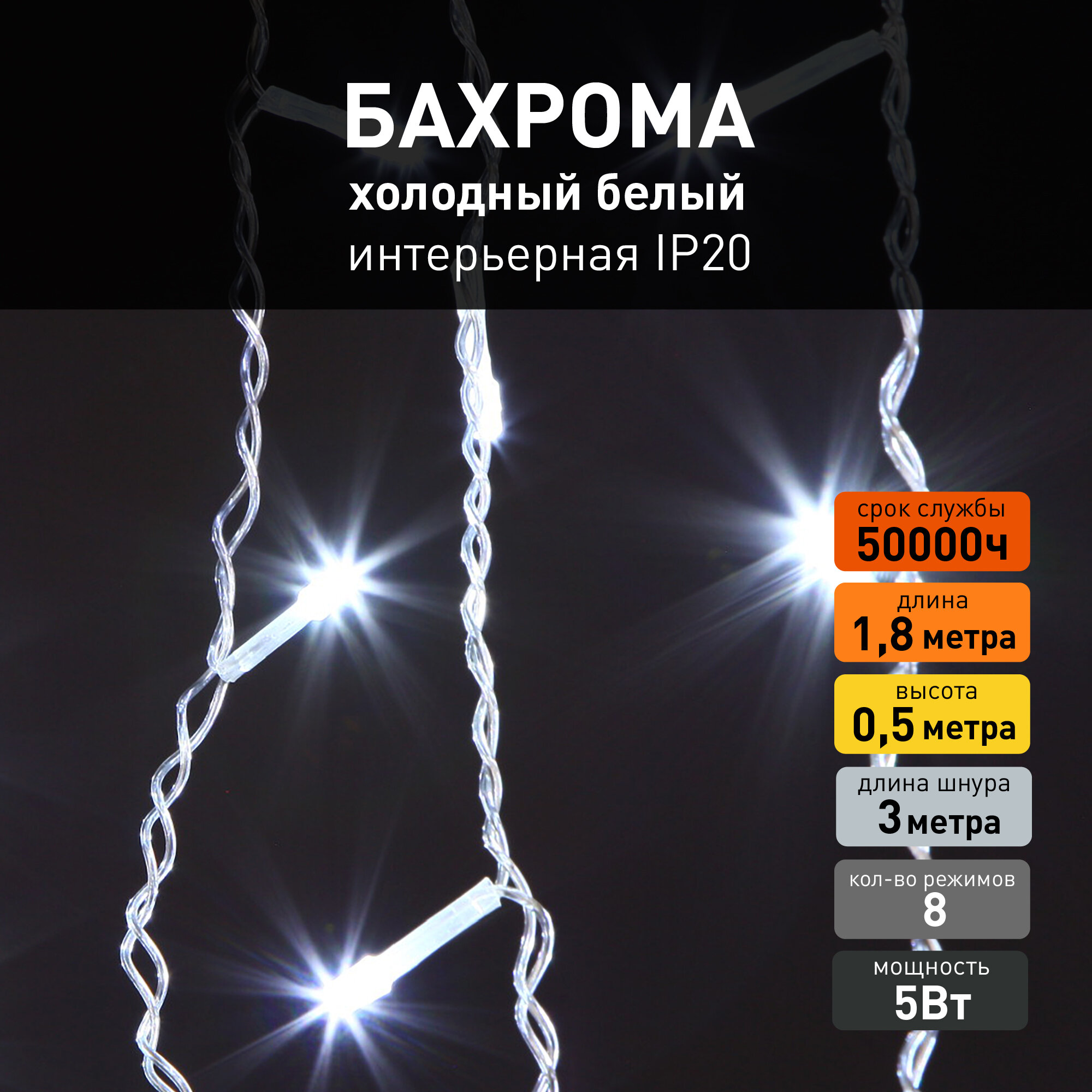 Новогодняя интерьерная светодиодная гирлянда Eurosvet 100-002, выполнена в виде бахромы длиной 1,8 и высотой 0,5 метра, имеет белый цвет свечения. Такая гирлянда предназначена для придания праздничного и нарядного оформления окон, вывесок, каминов, и украшения фотозон. Гирлянда бахрома Евросвет представляет собой горизонтальный провод-основание, на котором закреплены через равные промежутки нити с лампочками. Бахрома отличается от занавеса тем, что вертикальные нити имеют разную длину. Благодаря этому создается эффект, напоминающий дождь. Гирлянда - бахрома имеет 8 режимов свечения, переключение происходит последовательно нажатием кнопки на контроллере. 1. Комбинированный (воспроизводятся все режимы свечения по очереди); 2. Волнообразный; 3. Последовательный; 4. Перетекающий; 5. Бегущая вспышка; 6. Затухающий (плавное зажигание и постепенное затухание); 7. Мерцающий (последовательное мерцание); 8. Постоянный (статичное свечение). Шнур питания имеет длину 3 метра. В гирляндах используются медные провода диаметром 1,5 мм с 7 медными жилами. Оплетка провода прозрачного цвета, выполнена из качественного ПВХ, провод имеет легкую изоляцию и защиту от перепадов напряжения. Рекомендуемая температура эксплуатации -10 +40 градусов по Цельсию. Количество светодиодов 64 шт. Мощность - 5 Вт, питание от сети 230 В. Производитель Eurosvet гарантирует качественную работу своих гирлянд до 50 000 ч и дает гарантию на свою продукцию 12 месяцев. Серия гирлянд бахромы 100-001 выпускается в 3х цветах теплый белый (арт. 600009051014), мульти (арт. 600001669435), белый (арт. 600001669434) Или можно рассмотреть серию 100-002 там каждый провод бахромы заканчивается оригинальной звездочкой (арт. 600002466747 и 600002466748).