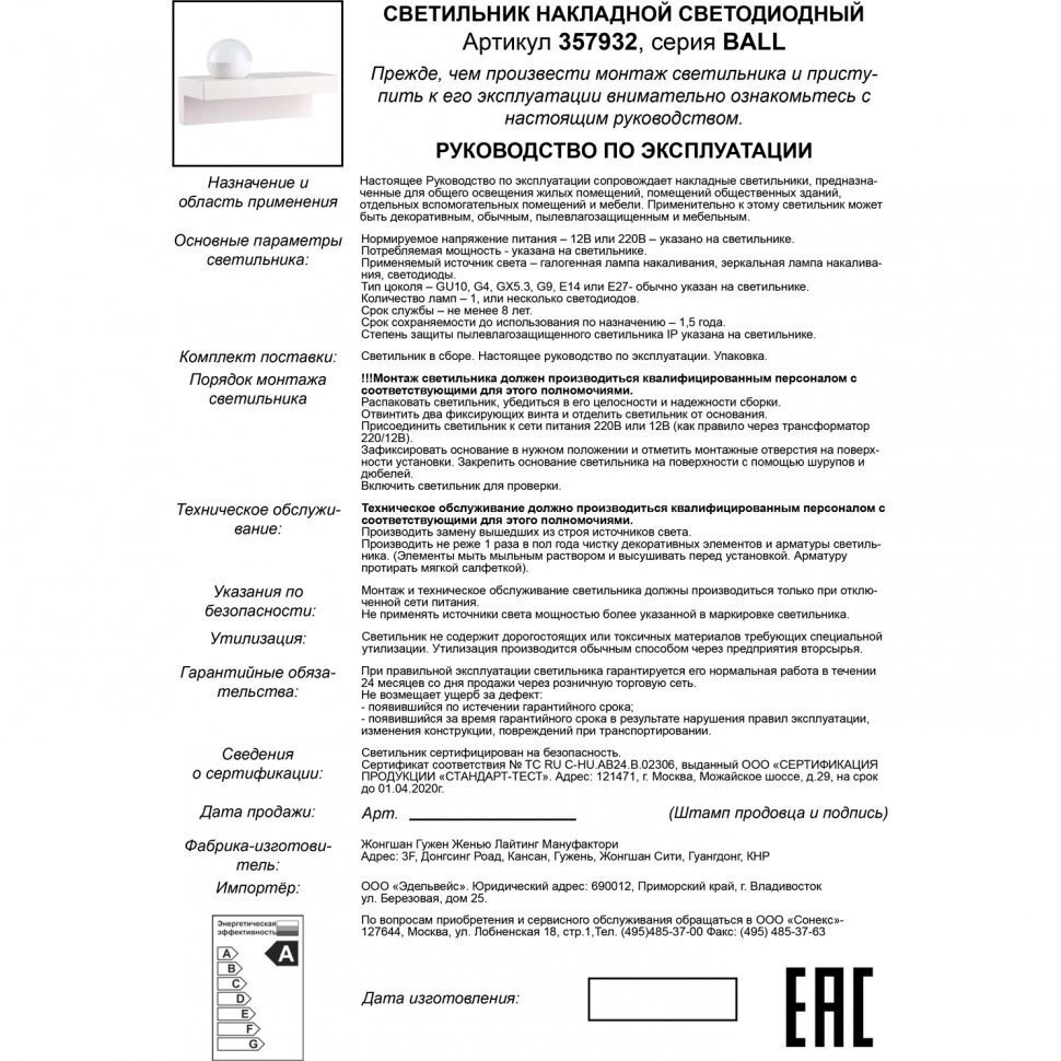 Настенный светильник Ball 357932 - продукт известной компании Novotech (Венгрия). Имеет максимальную мощность 8 Вт, освещает площадь до 2 кв. м. Отлично подойдет для таких мест, как гостиная, спальня. Впишется в интерьеры следующих стилей: техно.