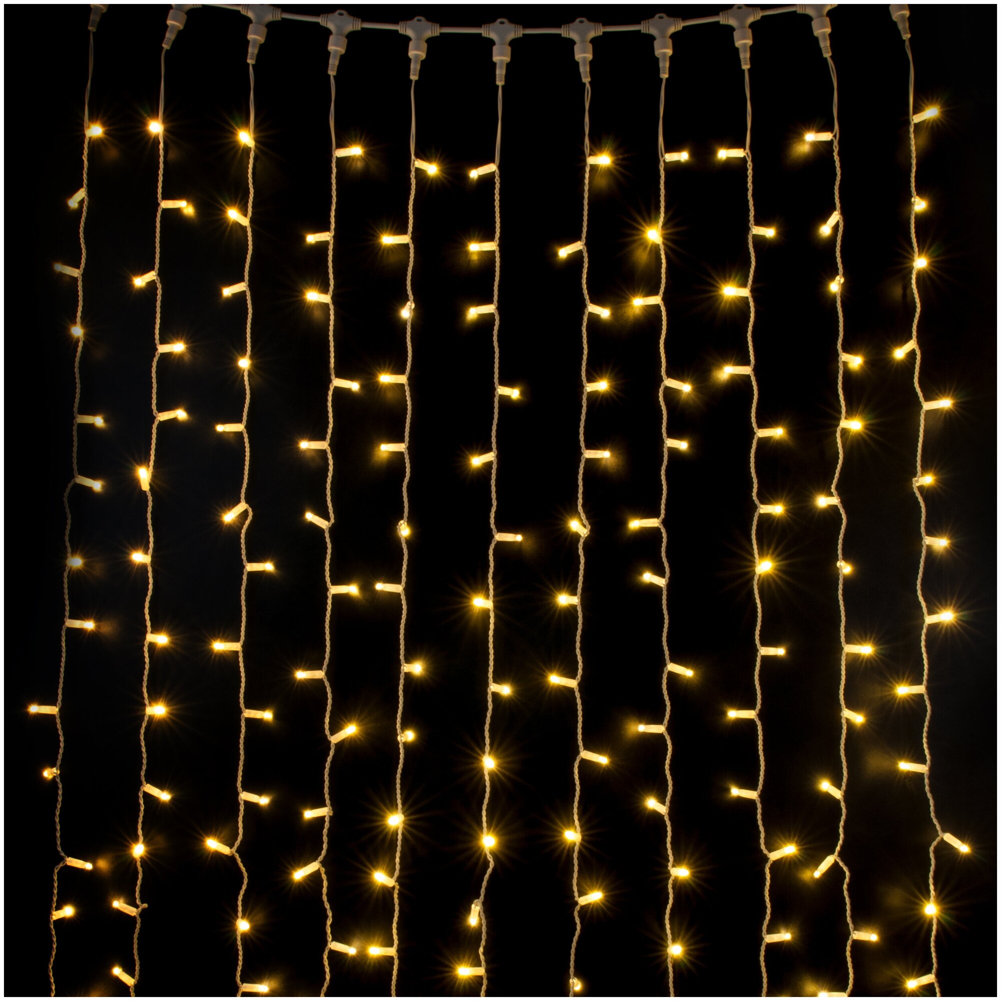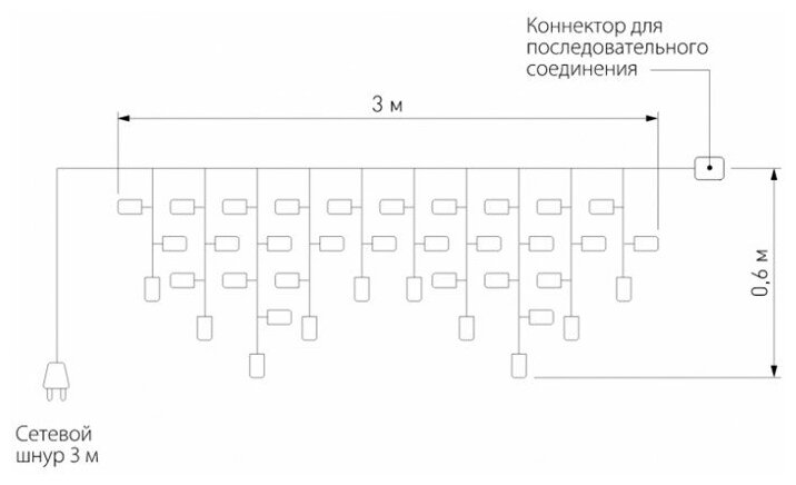 Новогодняя светодиодная уличная гирлянда Eurosvet 200-101, выполнена в виде светового занавеса, который светит постоянным холодным белым светом, имеет длину 2 м и высоту 3 м, с помощью такой гирлянды вы сможете украсить деревья, заборы, садовые участки, фасады домов и крыши, а также интерьер внутри помещения. Гирлянда занавес представляет собой горизонтальный провод-основание, на котором закреплены, через равные промежутки, нити одинаковой длины с лампочками. Гирлянда имеет высокую степень пылевлагозащиты IP65 и способна бесперебойно работать практически в любую погоду, рекомендуемая температура эксплуатации -40 +50 градусов по Цельсию. Гирлянда Евросвет легко переносит перепады температуры. Благодаря большой длине 2 метра и высоте 3 метра гирлянда занавес отлично подойдет для украшения больших объектов, а с помощью специального коннектора, который входит в комплект к гирлянде, можно последовательно соединить до 5 таких гирлянд, что дает неограниченные возможности для праздничного украшения. Коннекторы у гирлянды имеют медную контактную площадку, что обеспечивает наилучшую токопроводимость. Шнур питания длиной 3 метра позволяет легко подключить гирлянду внутри помещения. Провод белого цвета, покрыт морозостойкой ПВХ изоляцией, который препятствует обледенению и последующему излому провода. В гирляндах используются толстые медные провода диаметром 2,3 мм. Гирлянда имеет диодный мост на сетевом шнуре, что обеспечивает немерцающее свечение и защиту от выгорания при перепадах напряжения. Гирлянды занавесы имеют 2 параллельные цепи в которых диоды соединены последовательно, перегорание 1 диода приведет к потуханию одной цепочки, а не всей гирлянды. Количество светодиодов 600 шт. Мощность – 60 Вт, питание от сети 230 В, 1 постоянный режим свечения. Производитель Eurosvet гарантирует качественную работу своих гирлянд до 50 000 ч и дает гарантию на свою продукцию 12 месяцев. Серия гирлянд 200-101 выпускается в 2х цветах с постоянным свечением или с эффектом мерцания: белый теплый постоянный (арт. 600004764179) / мерцающий (арт. 600004764180); белый холодный постоянный (арт. 600001669422) / мерцающий (арт. 600001669423).