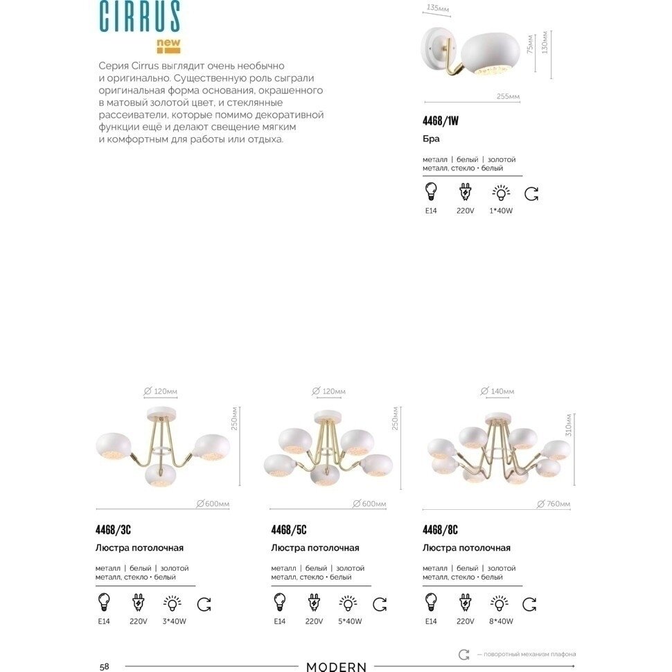 Бра Cirrus 4468/1W - продукт известной компании Lumion (Италия). Имеет максимальную мощность 40 Вт, освещает площадь до 2 кв. м. Отлично подойдет для таких мест, как гостиная, прихожая и коридор, спальня. Впишется в интерьеры следующих стилей: модерн.