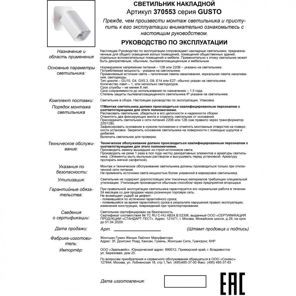 Спот Gusto 370553 - продукт известной компании Novotech (Венгрия). Имеет максимальную мощность 50 Вт, освещает площадь до 4 кв. м. Отлично подойдет для таких мест, как гостиная, спальня. Впишется в интерьеры следующих стилей: техно.