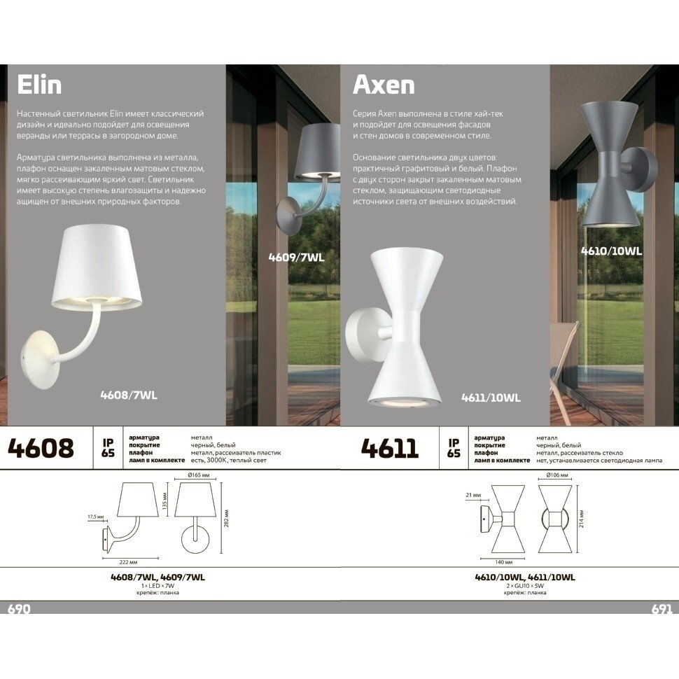 Настенный фонарь уличный Elin 4609/7WL - продукт известной компании Odeon Light (Италия). Имеет максимальную мощность 7 Вт, освещает площадь до 1 кв. м. Отлично подойдет для таких мест, как дача, фасад, веранда и беседка. Впишется в интерьеры следующих стилей: модерн, минимализм.
