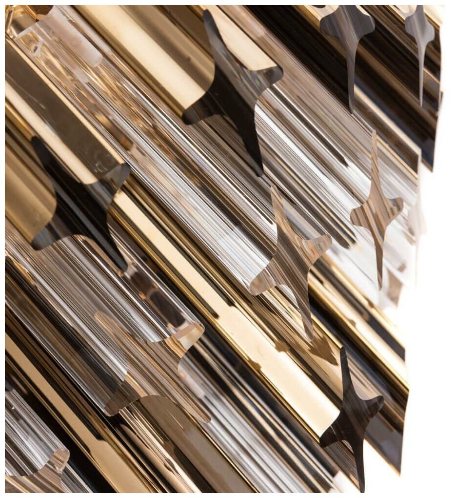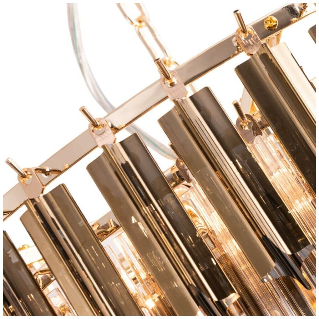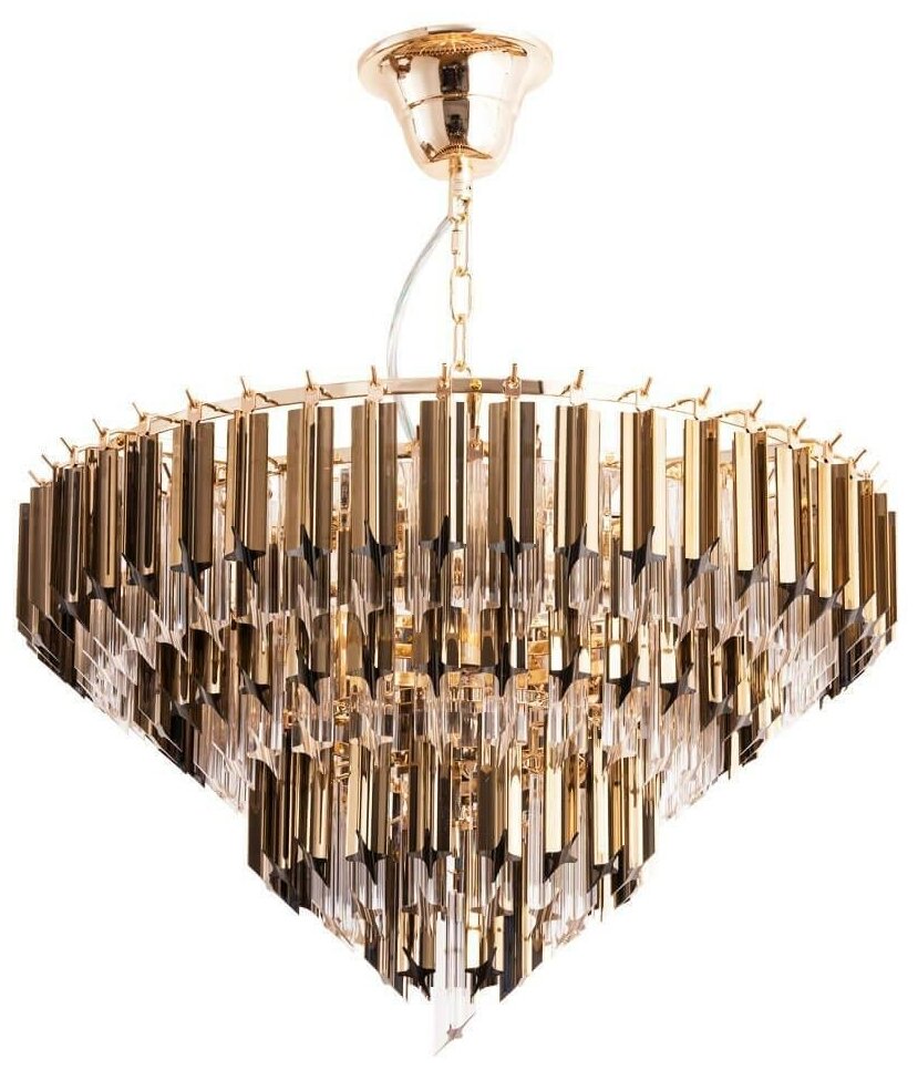 Подвесной светильник стиля модерн для гостиной, кабинета, прихожей или спальни имеет размеры 560x1500 мм. Арматура светильника окрашена в золотой цвет. Лампы в комплекте - отсутствуют. В светильнике применяются лампы накаливания или светодиодная LED-лампа. Цвет плафонов - золотой, с глянцевой поверхностью. Материал плафонов - металл. Класс электробезопасности - I, степень пылевлагозащиты (IP) - 20. Максимальная мощность лампы (Вт) - 60. Светильник размещается на потолоке.