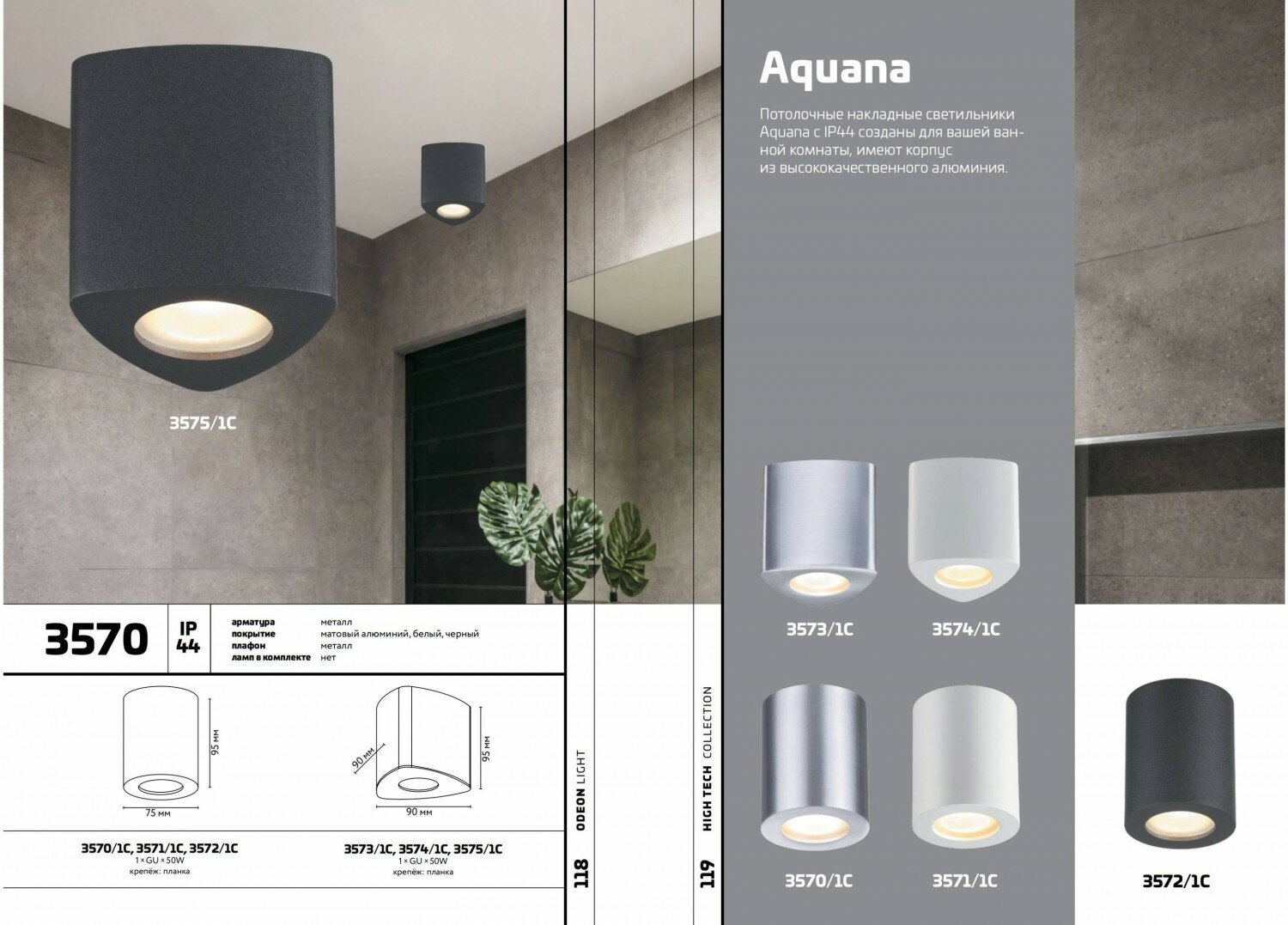 Точечный накладной светильник Aquana 3571/1C - продукт известной компании Odeon Light (Италия). Имеет максимальную мощность 50 Вт. Отлично подойдет для таких мест, как ванная. Впишется в интерьеры следующих стилей: хай-тек.