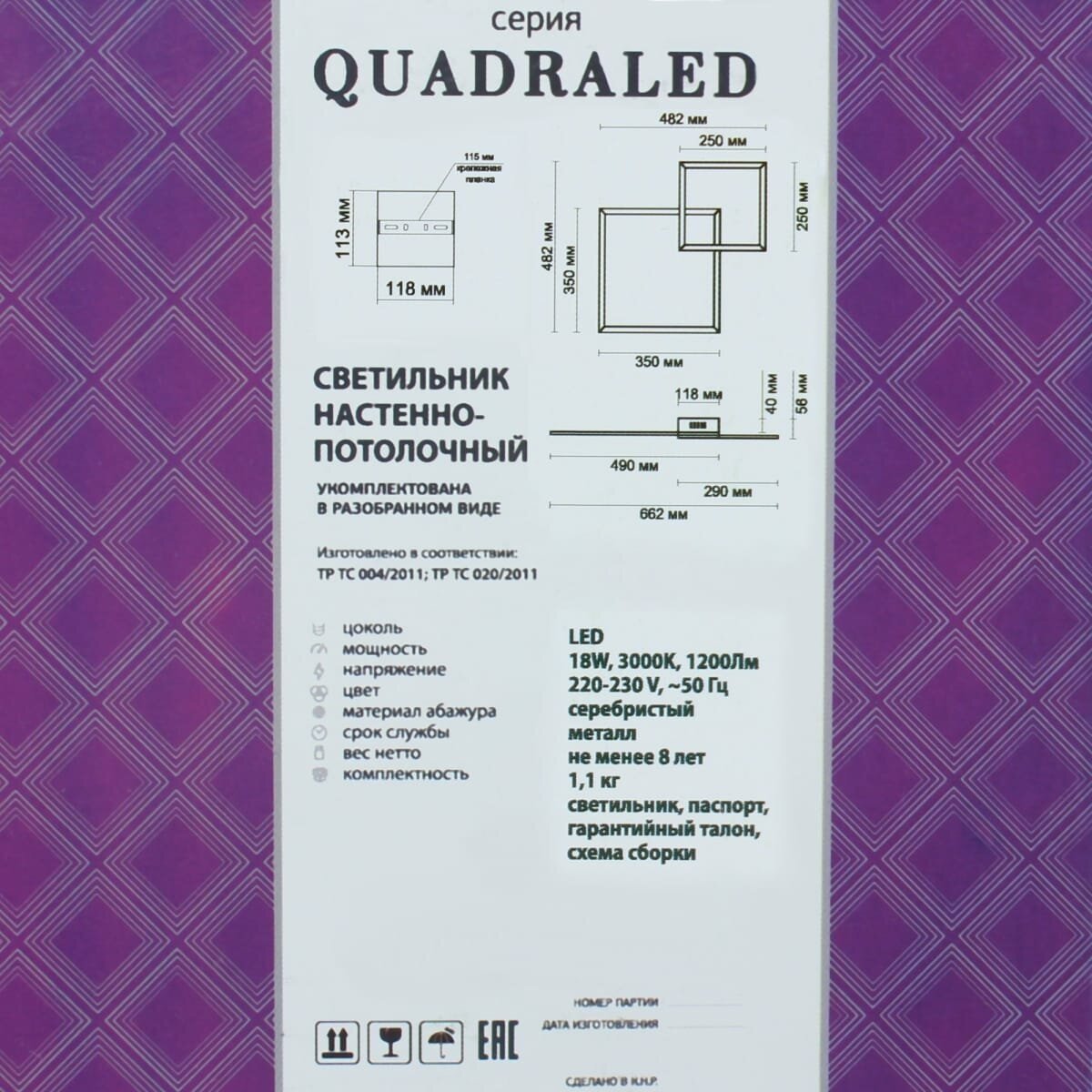| Форма плафона | Квадратный |