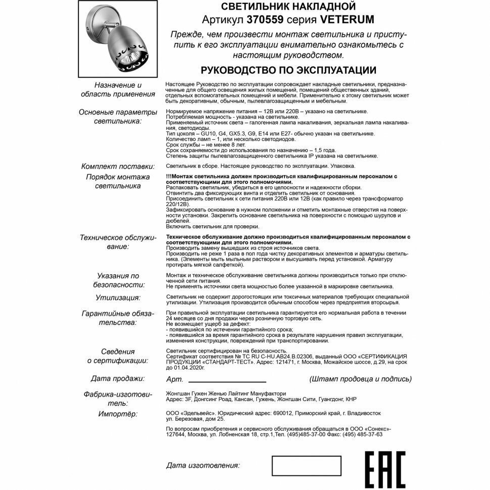 Спот Veterum 370559 - продукт известной компании Novotech (Венгрия). Имеет максимальную мощность 50 Вт, освещает площадь до 4 кв. м. Отлично подойдет для таких мест, как гостиная, спальня. Впишется в интерьеры следующих стилей: техно.
