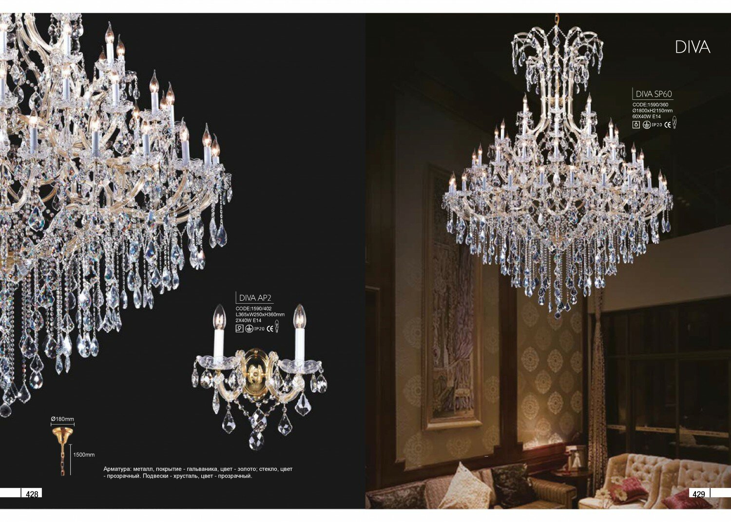 Большая люстра DIVA SP60 CHROME - продукт известной компании Crystal Lux (Испания). Имеет максимальную мощность 2400 Вт, освещает площадь до 120 кв. м. Отлично подойдет для таких мест, как гостиная, кафе, холл, прихожая и коридор. Впишется в интерьеры следующих стилей: классический, барокко.