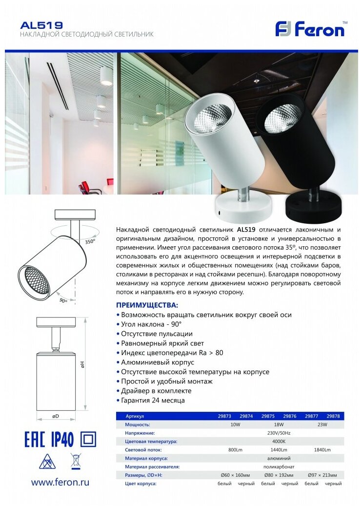 Накладной светильник AL519 29876 - продукт известной компании Feron (Китай). Имеет максимальную мощность 18 Вт, освещает площадь до 4 кв. м. Отлично подойдет для таких мест, как гостиная, прихожая и коридор, кафе, кухня, офис. Впишется в интерьеры следующих стилей: современный.