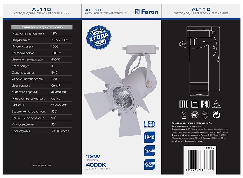 Светодиодный светильник Feron AL110 трековый однофазный на шинопровод 12W 4000K 35° белый Артикул 32554