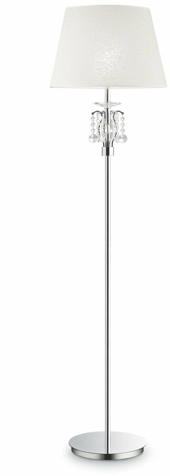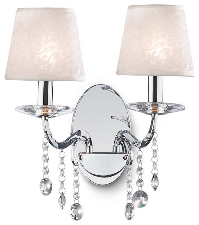 Основание светильника создано из металла цвета хром и хрусталя. Изделие украшено прозрачными подвесками. Плафон выполнен из ПВХ, внешнее покрытие которого – полотно, декорированное рельефным цветочным рисунком. Благодаря источнику освещения такого типа в комнате будет создана комфортная и уютная обстановка.