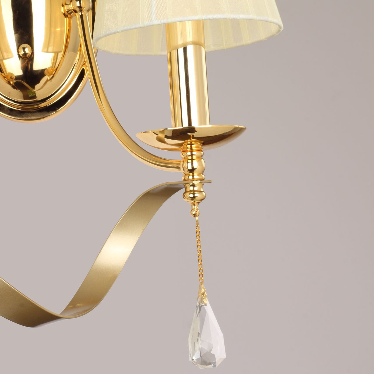 Арматура светильника выполнена из металла и имеет золотой цвет, что придает ему роскошный и элегантный вид. Плафон изготовлен из ткани и хрусталя, что делает его еще более привлекательным и уникальным.