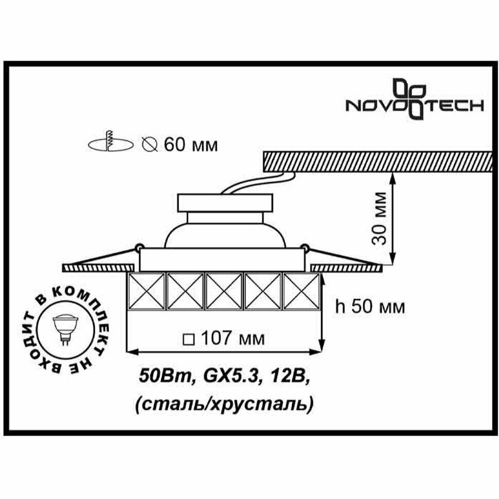 Встраиваемый светильник - продукт известной компании Novotech (Венгрия). Имеет максимальную мощность 50 Вт, освещает площадь до 4 кв. м. Отлично подойдет для таких мест, как кафе, кухня. Впишется в интерьеры следующих стилей: модерн.