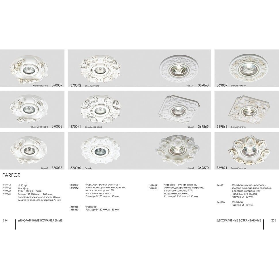 Встраиваемый светильник Farfor 370041 - продукт известной компании Novotech (Венгрия). Имеет максимальную мощность 50 Вт, освещает площадь до 4 кв. м. Отлично подойдет для таких мест, как кафе, кухня. Впишется в интерьеры следующих стилей: классический.