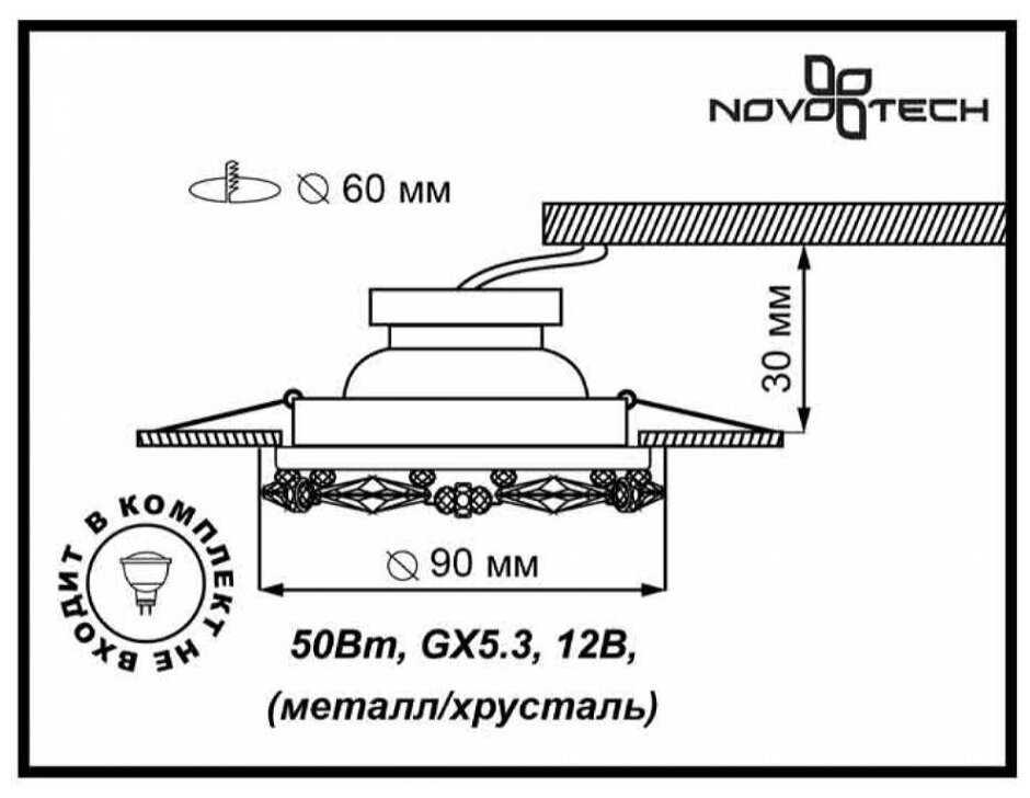 Встраиваемый светильник - продукт известной компании Novotech (Венгрия). Имеет максимальную мощность 50 Вт. Отлично подойдет для таких мест, как кафе, кухня. Впишется в интерьеры следующих стилей: модерн.