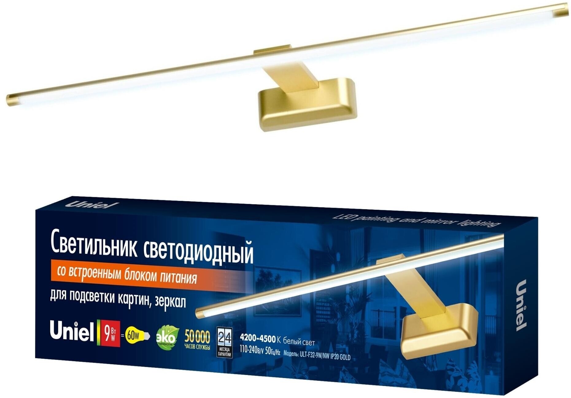 Подсветка для картин светодиодная - продукт известной компании Uniel (Китай). Имеет максимальную мощность 9 Вт, освещает площадь до 1.8 кв. м. Отлично подойдет для таких мест, как гостиная, кафе, кабинет, офис, экспозиция, магазин. Впишется в интерьеры следующих стилей: современный.