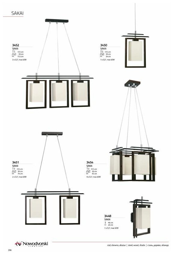 Подвесной светильник Sakai 3450 - продукт известной компании Nowodvorski (Польша). Имеет максимальную мощность 60 Вт, освещает площадь до 3 кв. м. Отлично подойдет для таких мест, как прихожая и коридор, кафе, кухня. Впишется в интерьеры следующих стилей: современный.