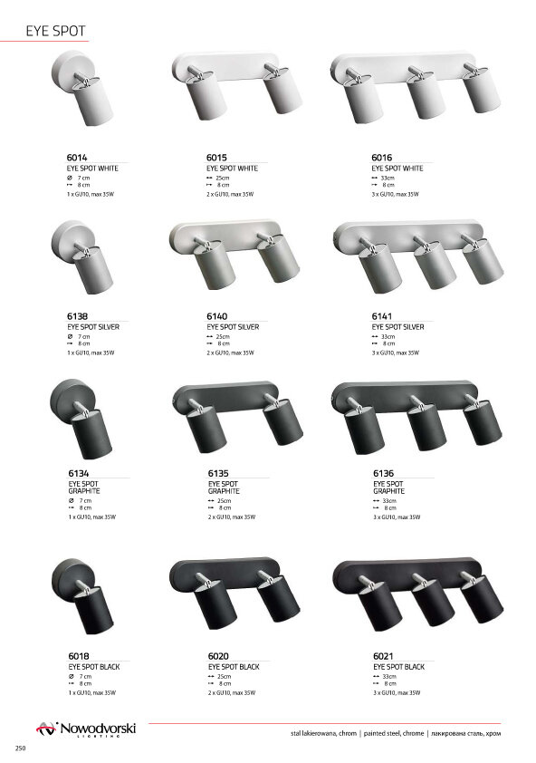 Спот Eye Spot 6018 - продукт известной компании Nowodvorski (Польша). Имеет максимальную мощность 35 Вт, освещает площадь до 3 кв. м. Отлично подойдет для таких мест, как гостиная. Впишется в интерьеры следующих стилей: современный.