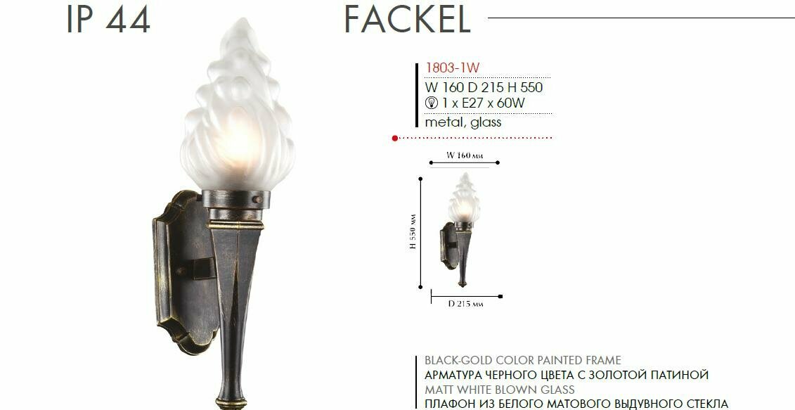 Настенный фонарь уличный Fackel 1803-1W - продукт известной компании Favourite (Германия). Имеет максимальную мощность 60 Вт, освещает площадь до 3 кв. м. Отлично подойдет для таких мест, как дача, фасад, веранда и беседка. Впишется в интерьеры следующих стилей: классический, ампир.
