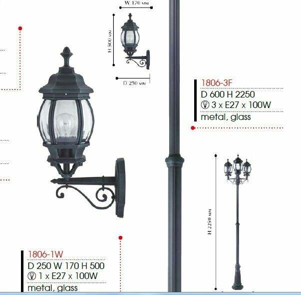 Настенный фонарь уличный Paris 1806-1W - продукт известной компании Favourite (Германия). Имеет максимальную мощность 100 Вт, освещает площадь до 5 кв. м. Отлично подойдет для таких мест, как дача, фасад, веранда и беседка. Впишется в интерьеры следующих стилей: классический, замковый.