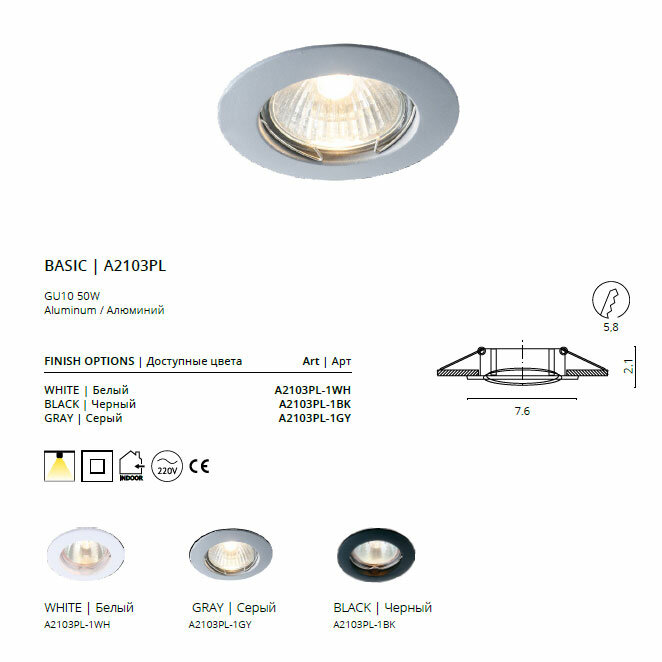 Точечный светильник из серии «2103» от производителя Arte Lamp (Италия). Дизайн-стиль современный. Отлично подойдет для такого типа помещений, как магазин. Цвет товара серый. Используемые материалы: металл. С учетом технических характеристик мощности хватит для освещения 2.7 м2. Способ крепления: монтажная пластина. Дизайн и форма плафона округлый. Направление плафонов вниз. Цоколь GU10. Вид ламп: галогеновая. Количество ламп 1 шт. Мощность одной лампы составляет 50 Вт. Общая мощность 50 Вт. Напряжение 220-240 Вольт. Уровень защищенности от влаги и пыли IP20. Расширенная гарантия на товар 2 года. Высота 21 мм. Диаметр 76 мм. Врезное отверстие 58 мм. Вес товара 0.075 кг. Комплектация: Точечный светильник. Инструкция по сборке/использованию. Детали, необходимые для сборки товара.Товар упакован в картонную коробку. В случае доставки транспортными службами или маркетплейсом добавляются дополнительные элементы упаковки для защиты от повреждений при транспортировке - усиление картоном, внутренний наполнитель, стрейч-пленка.