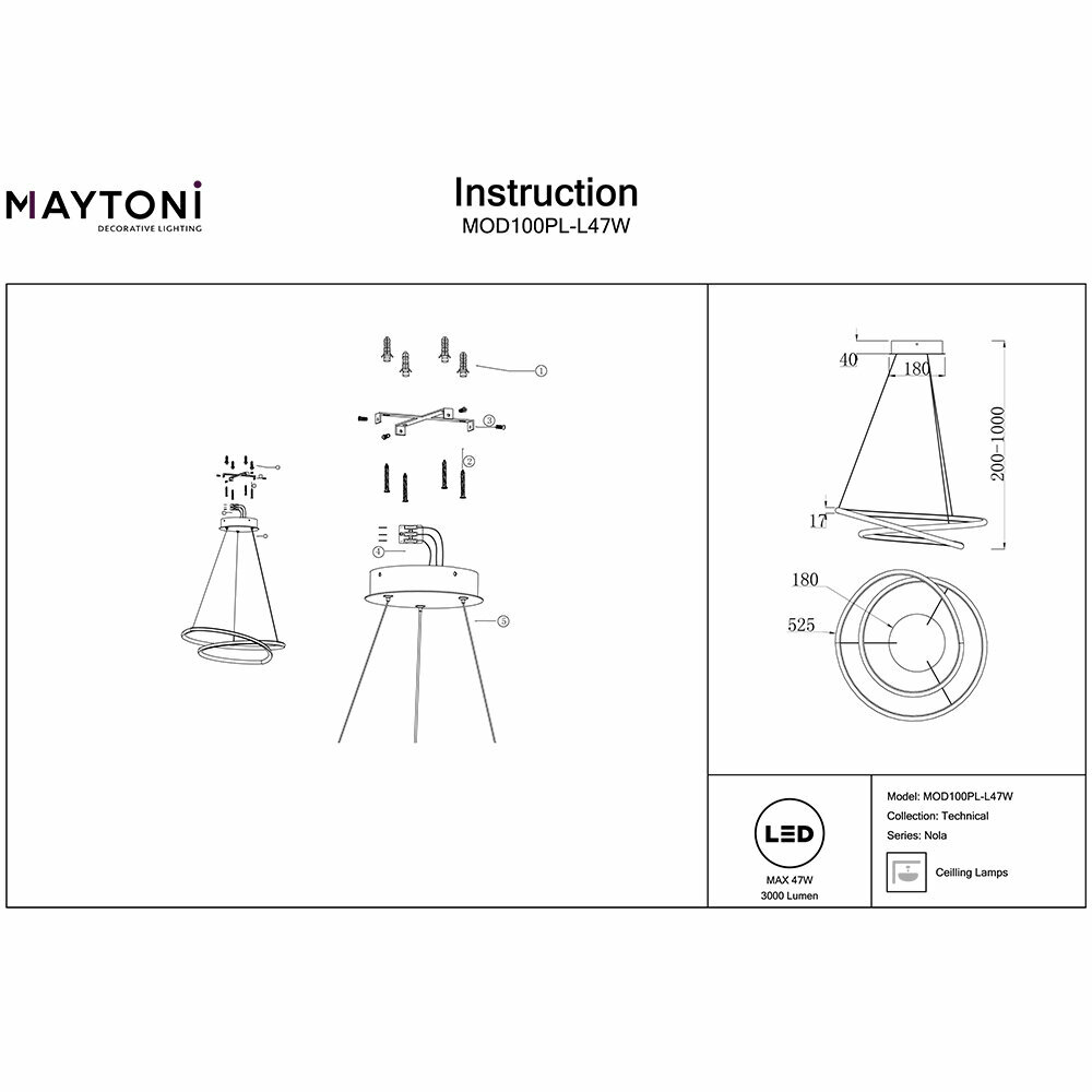 Подвесной светильник LED Nola MOD100PL-L47W - продукт известной компании Maytoni (Германия). Имеет максимальную мощность 47 Вт, освещает площадь до 9 кв. м. Отлично подойдет для таких мест, как гостиная, кафе, над обеденным столом, офис, над кухонным островом. Впишется в интерьеры следующих стилей: техно.