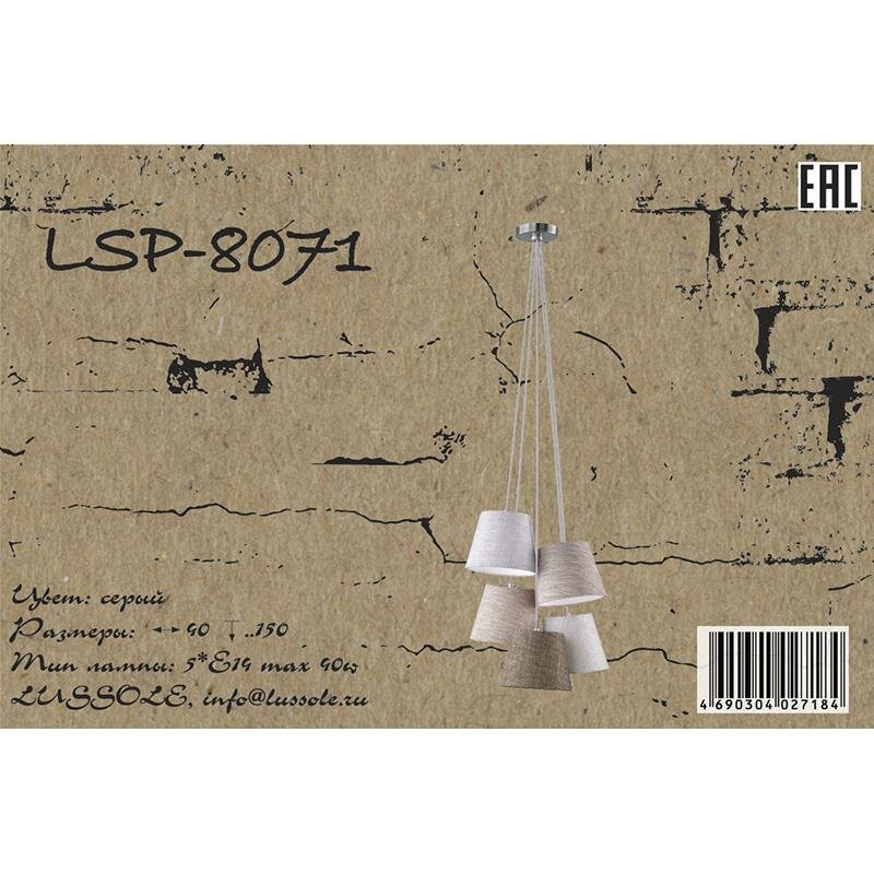 Люстра в современном стиле LSP-8071 из серии «Martinez» от производителя Lussole (Италия). Цвет: серый. Форма плафонов - конусные, направлены вниз. Используемые материалы: металл, текстиль. Цоколь E14, количество ламп - 5 шт., мощность одной ламочки 40 Вт. Степень пылевлагозащиты ip20. Напряжение 220V. Размеры: высота 1500 мм, диаметр 400 мм.Комплектация: Светильник. Инструкция по сборке/использованию. Детали, необходимые для сборки товара.Товар упакован в картонную коробку. В случае доставки транспортными службами или маркетплейсом добавляются дополнительные элементы упаковки для защиты от повреждений при транспортировке - усиление картоном, внутренний наполнитель, стрейч-пленка.