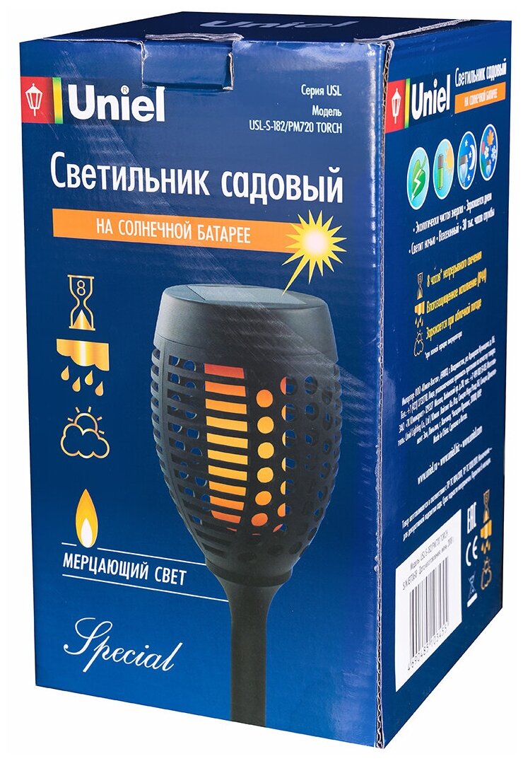 Солары серии Special — отличаются оригинальным дизайном, который идеально соответствует требованиям модных тенденций в оформлении садовых участков. Размещен такой светильник может быть в любом месте, которое освещается солнечными лучами. Светильник USL-S-182/PM720 Torch оснащен аморфной солнечной панелью размером 50х50 мм. Светильник Torch создает мерцающий свет (эффект горящего пламени).