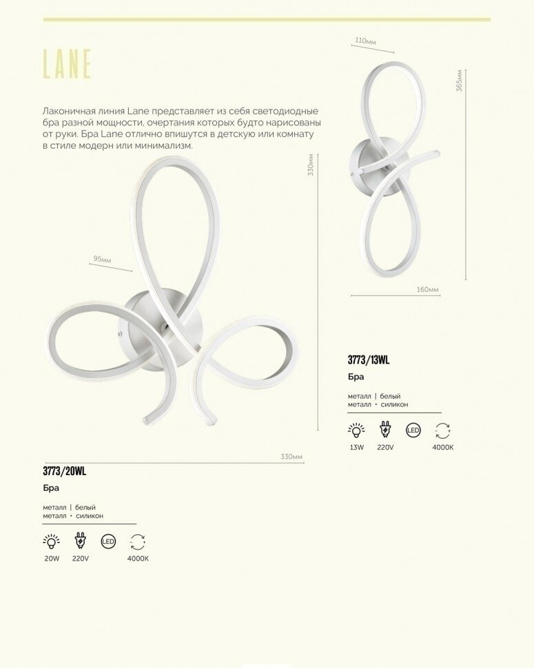 Бра Lane 3773/13WL - продукт известной компании Lumion (Италия). Имеет максимальную мощность 13 Вт. Отлично подойдет для таких мест, как гостиная, прихожая и коридор, спальня. Впишется в интерьеры следующих стилей: хай-тек.