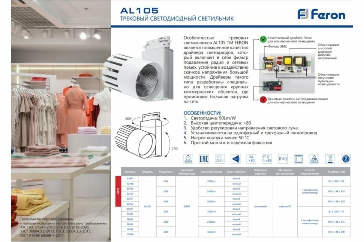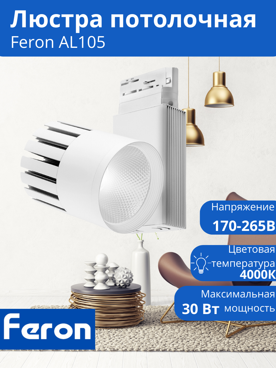 Светодиодный светильник Feron AL105 трековый на шинопровод 30W 4000K 35° белый 3-х фазный Артикул 32949