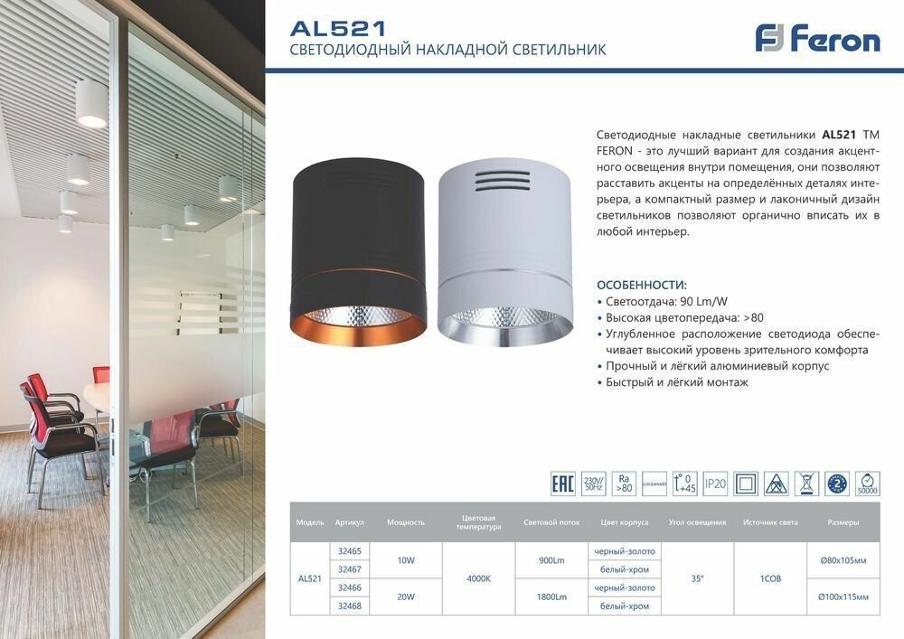 Накладной светильник светодиодный - продукт известной компании Feron (Китай). Имеет максимальную мощность 10 Вт. Отлично подойдет для таких мест, как гостиная, кафе, кухня, кабинет, офис, магазин. Впишется в интерьеры следующих стилей: техно.