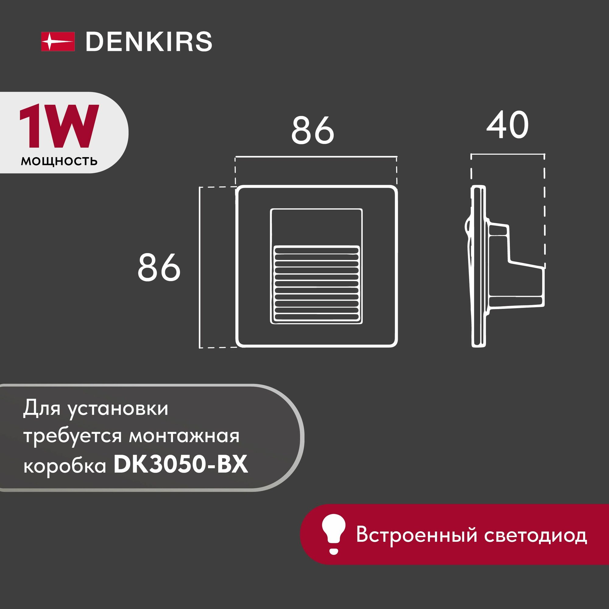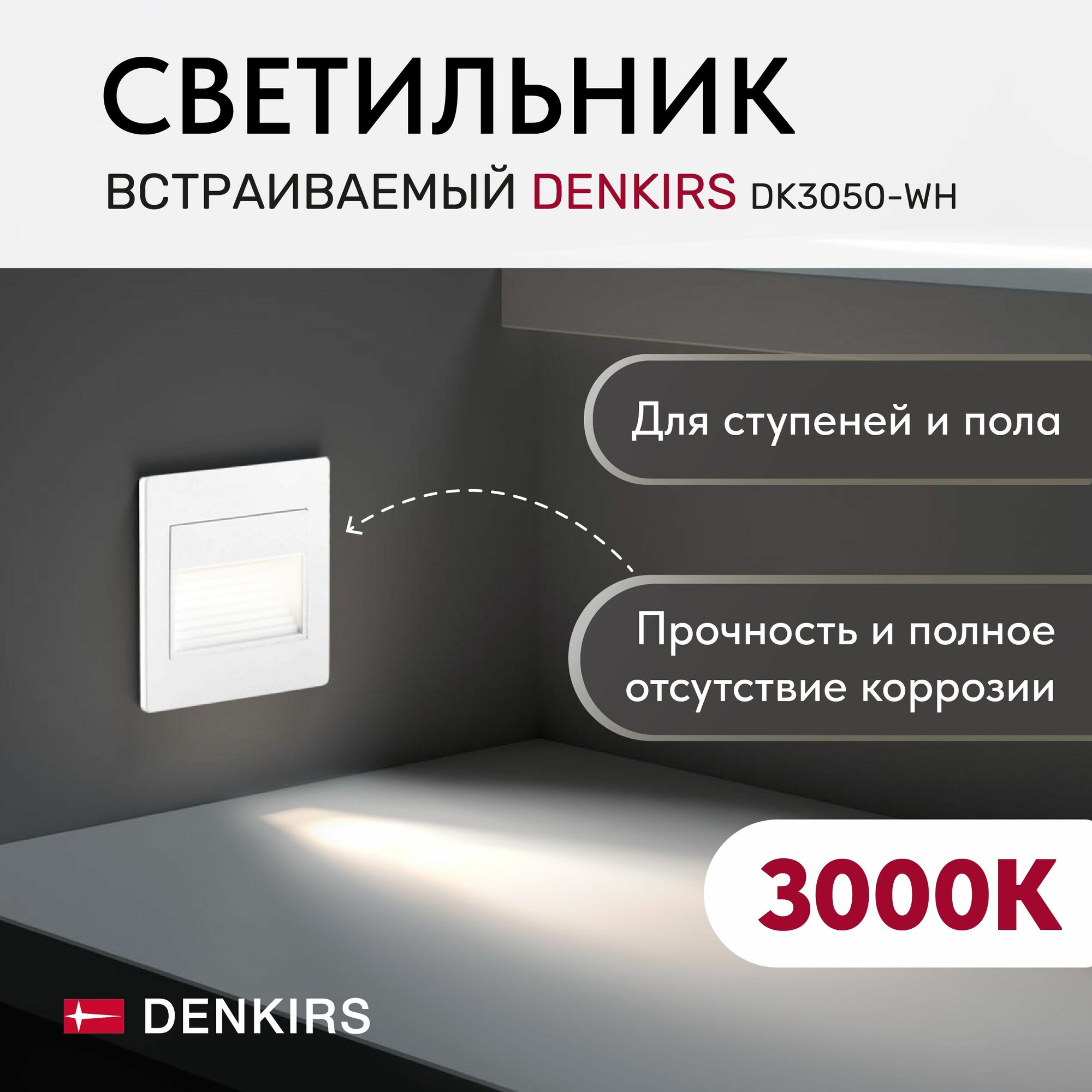 Подсветка для лестниц и ступеней DK3050-WH - продукт известной компании Denkirs (Дания). Имеет максимальную мощность 1 Вт, освещает площадь до 0.2 кв. м. Отлично подойдет для таких мест, как прихожая и коридор, кафе, холл, офис. Впишется в интерьеры следующих стилей: современный.