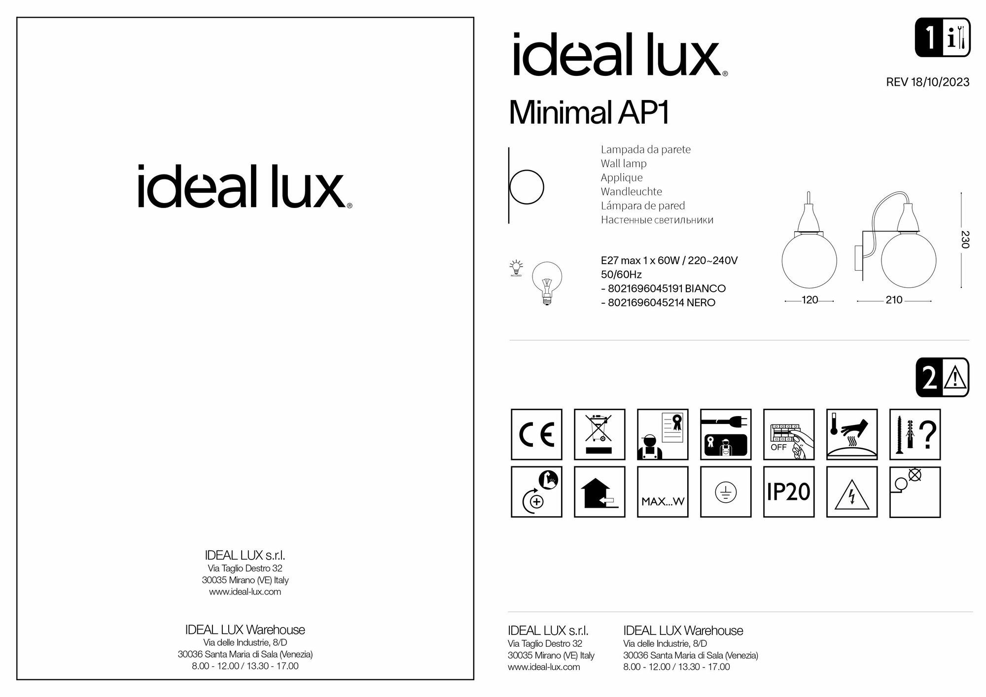 Светильник настенный Ideal Lux MINIMAL AP1 H23 макс.60Вт 860Лм 3000К Е27 IP20 230В Черный Металл 045214. Арматура из металла окрашенного в черный цвет. Энергосберегающая галогенная лампочка входит в комплект, Globo D125 8Вт. Оболочка электрического шнура покрыта тканью.