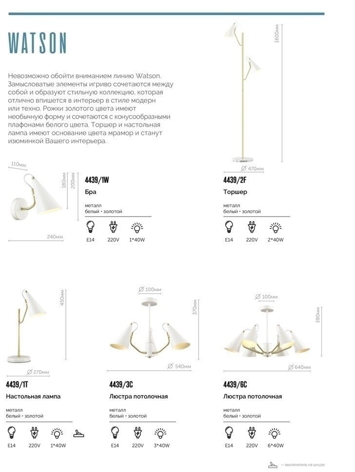 | Описание серии для сайта | Невозможно обойти вниманием линию Watson. Замысловатые элементы игриво сочетаются между собой и образуют стильную коллекцию, которая отлично впишется в интерьер в стиле модерн или техно. Рожки золотого цвета имеют необычную форму и сочетаются с конусообра |