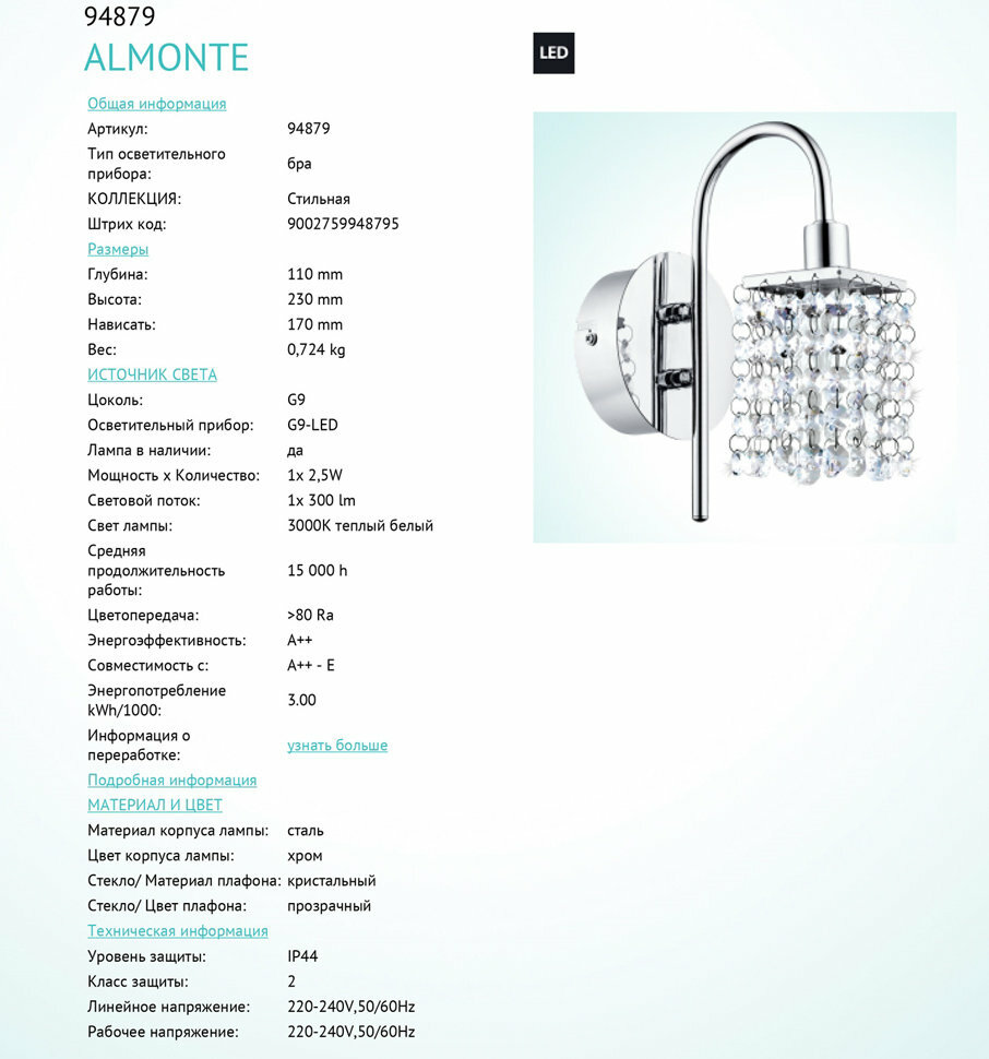 Настенный светильник - продукт известной компании Eglo (Австрия). Имеет максимальную мощность 2.5 Вт. Отлично подойдет для таких мест, как гостиная, зал, спальня. Впишется в интерьеры следующих стилей: арт-деко.