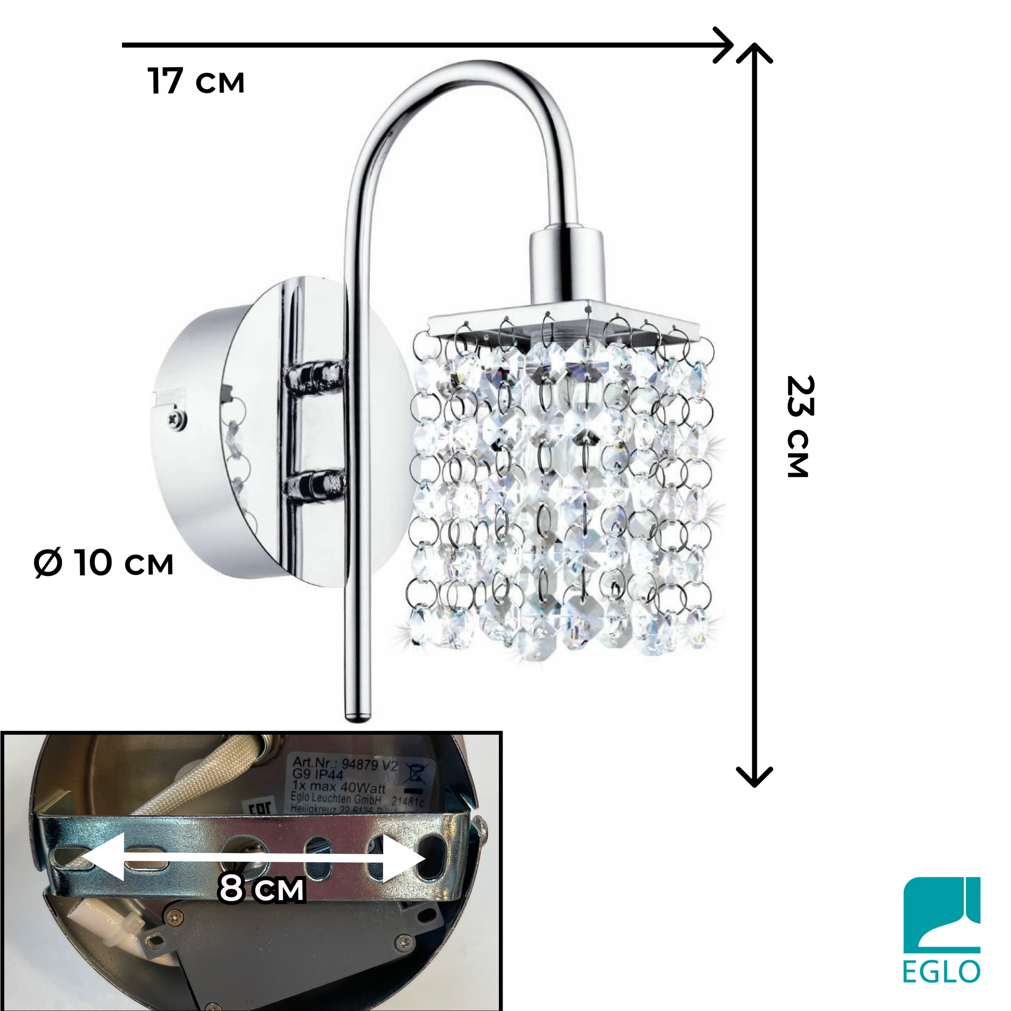 - Материал основания: сталь, материал плафона: хрусталь