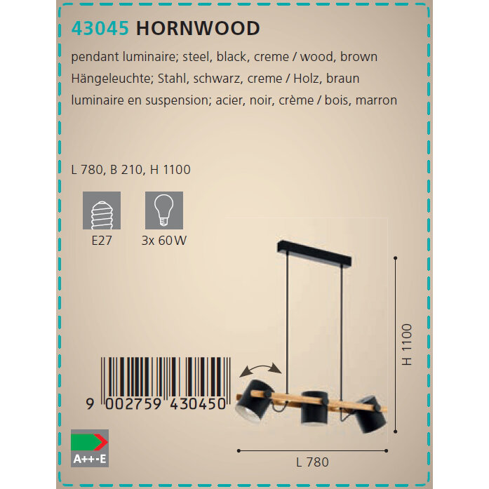 Подвесной светильник Hornwood 43045 - продукт известной компании Eglo (Австрия). Имеет максимальную мощность 180 Вт, освещает площадь до 9 кв. м. Отлично подойдет для таких мест, как гостиная, кафе, кухня, над кухонным островом, офис. Впишется в интерьеры следующих стилей: лофт.