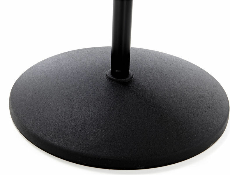 Конструкция выполнена из прочной стали с долговечным порошковым покрытием. В основании предусмотрено резиновое кольцо, которое эффективно гасит вибрации и шаговые шумы, особенно актуальные при использовании на сцене или в зале с твёрдым полом. Благодаря складному механизму стойка удобна для транспортировки и хранения.