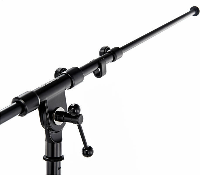 Особенность модели - двухсекционная телескопическая стрела длиной от 435 до 745 мм. Она позволяет точно отрегулировать положение микрофона, подстраивая его под индивидуальные требования исполнителя или акустики помещения. Стрела оснащена надёжным фиксатором T-bar, обеспечивающим лёгкую регулировку и надёжную фиксацию.