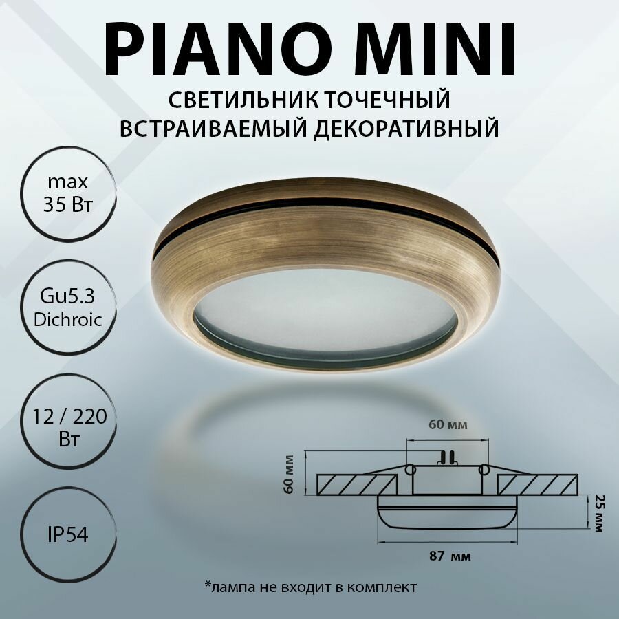 Точечный светильник 011278 из серии «Piano mini» от производителя Lightstar (Италия). Дизайн-стиль модерн. Отлично подойдет для такого типа помещений, как ванная. Цвет товара бронзовый. Используемые материалы: металл, стекло. С учетом технических характеристик мощности хватит для освещения 2.7 м2. Дизайн и форма плафона округлый. Цоколь GU5.3. Вид ламп: галогеновая. Количество ламп 1 шт. Мощность одной лампы составляет 50 Вт. Общая мощность 50 Вт. Напряжение 220-240 Вольт. Уровень защищенности от влаги и пыли IP65. Расширенная гарантия на товар 2 года. Высота 25 мм. Диаметр 87 мм. Глубина 60 мм. Врезное отверстие 60 мм. Встраиваемая часть по высоте 60 мм. Вес товара 0.202 кг. Комплектация: Точечный светильник. Инструкция по сборке/использованию. Детали, необходимые для сборки товара.Товар упакован в картонную коробку. В случае доставки транспортными службами или маркетплейсом добавляются дополнительные элементы упаковки для защиты от повреждений при транспортировке - усиление картоном, внутренний наполнитель, стрейч-пленка.