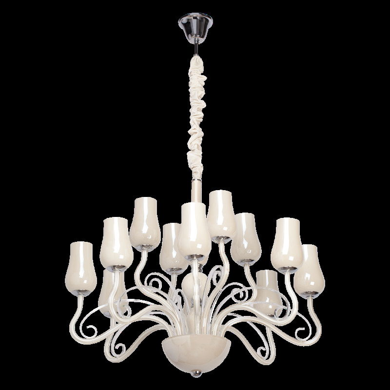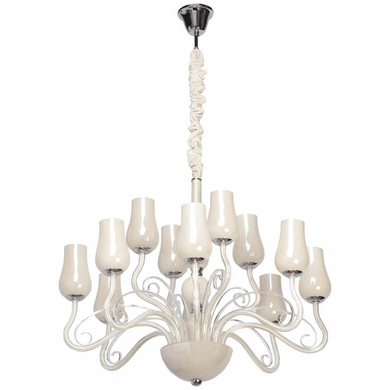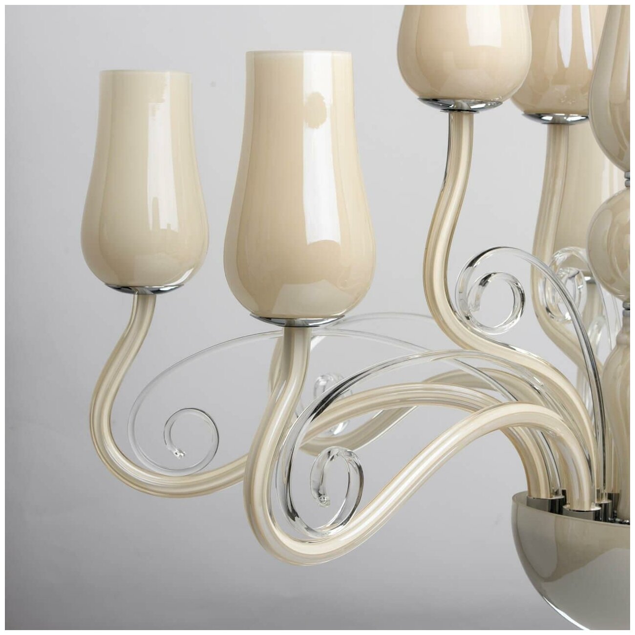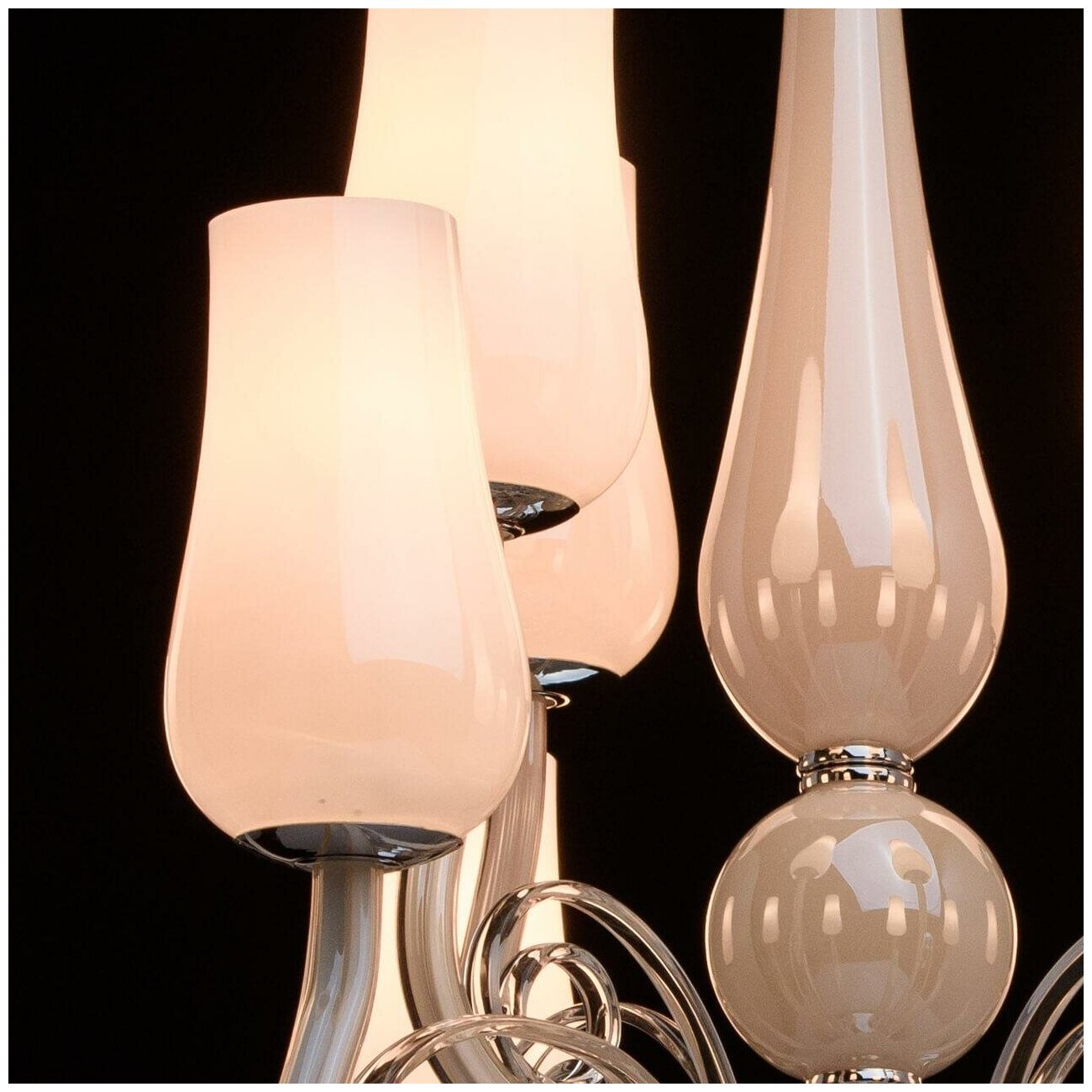 Основание светильника выполнено из сплава железа и гальванизировано в цвет хрома. Металлическая центральная ось закрыта декоративными элементами из стекла, окрашенного в массе в жемчужный цвет. Рожки выполнены из дутого стекла, окрашенного изнутри. Рожки декорированы элементами из прозрачного гутного стекла ручной работы. Плафоны выполнены из стекла окрашенного в массе в жемчужный цвет и отлитого в форму.