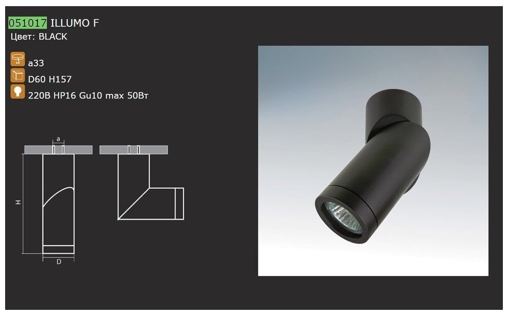 Название: Спот Lightstar Illumo F 051017Стильный накладной точечный светильник Illumo F от бренда Lightstar предназначен для помещений самых разных категорий и выполнен в изысканном современном стиле. Он изготовлен из высококачественных материалов и имеет элегантный дизайн, который подчеркнет индивидуальность вашего интерьера.Характеристики:- Кол-во ламп - 1 шт.- Цвет плафона - черный- Материал - металл- Высота - 15,7 см- Ширина - 6 см- Вес - 0,586 кг- Мощность - 50 Вт- Цоколь - GU10- Площадь освещения - 2,8 м²- Напряжение - 220V- Класс электробезопасности - I- Степень пылевлагозащиты - IP65- Стиль - хай-текПреимущества:- Возможность подключения диммера.- Поворотные плафоны, которые позволяют изменять направление света.- Стильный дизайн.- Высокое качество материалов.- Надежность и долговечность.- Легкость установки и эксплуатации.С помощью этого светильника вы сможете создать уютную атмосферу в любом помещении. Он идеально подойдет для спальни, гостиной, кухни, ванной, кафе, офисных помещений и других мест, где требуется дополнительное освещение.Светильник Illumo F выполнен из прочного металла и стекла, что обеспечивает его долговечность и надежность. Он имеет современный дизайн, который будет гармонично смотреться в любом интерьере.Кроме того, светильник обладает высокой степенью защиты от пыли и влаги, что делает его идеальным выбором для использования в помещениях с повышенной влажностью, таких как ванные комнаты или кухни.Одним из главных преимуществ светильника является возможность подключения диммера, что позволяет регулировать яркость света в зависимости от потребностей. Таким образом, вы можете создать идеальное освещение для любого случая.Также стоит отметить, что светильник имеет поворотные плафоны, что позволяет изменять направление света и создавать нужную атмосферу в помещении. Кроме того, плафоны легко снимаются и заменяются, если необходимо.В целом, светильник Lightstar Illumo F - это высококачественный и стильный продукт, который станет отличным выбором для тех, кто ищет надежное и функциональное освещение для своего дома или офиса.