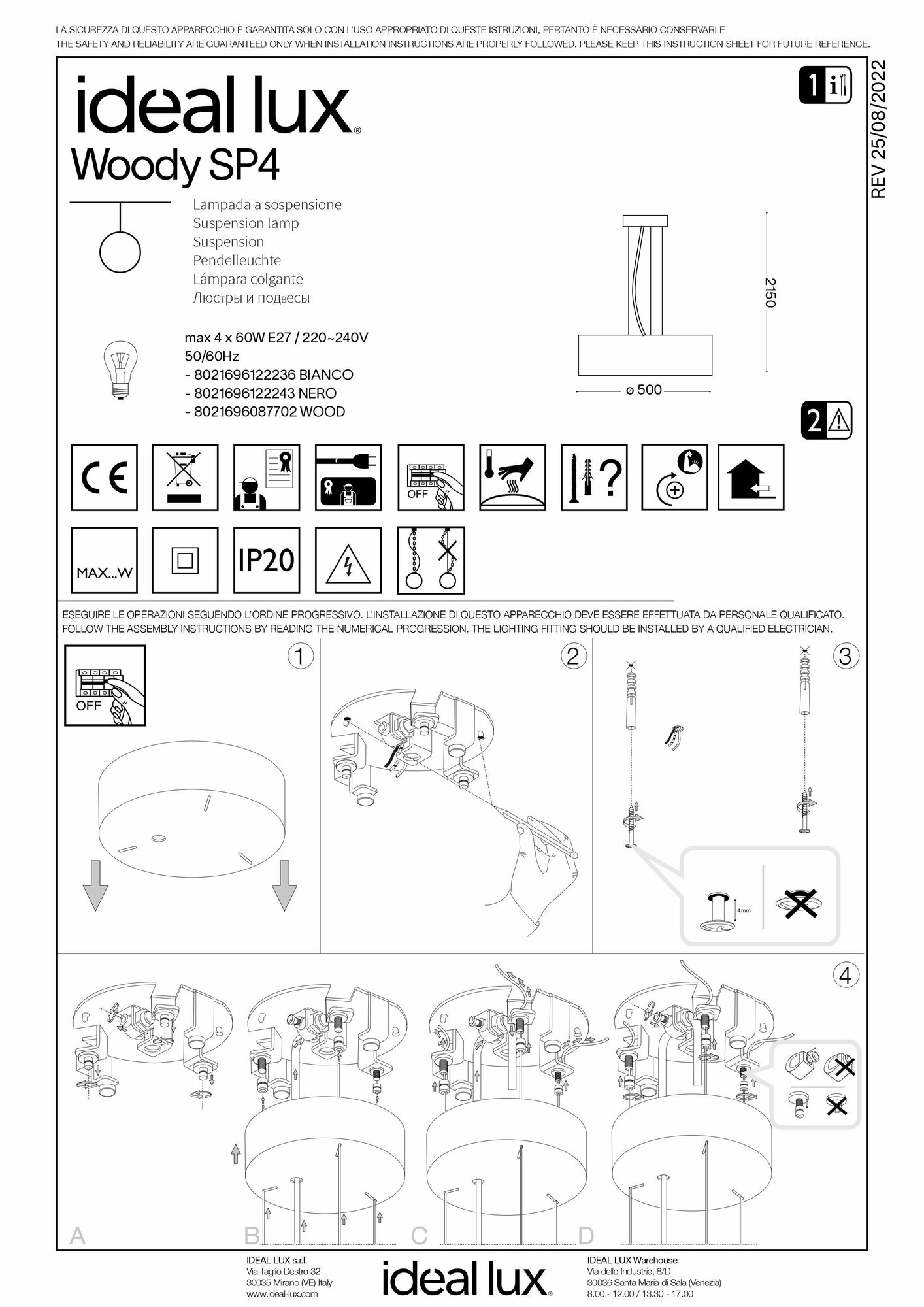 Подвесной светильник Woody SP4 WOOD - продукт известной компании Ideal Lux (Италия). Имеет максимальную мощность 240 Вт, освещает площадь до 12 кв. м. Отлично подойдет для таких мест, как гостиная, прихожая и коридор, кафе, холл, спальня, кухня, над обеденным столом, над кухонным островом. Впишется в интерьеры следующих стилей: модерн.