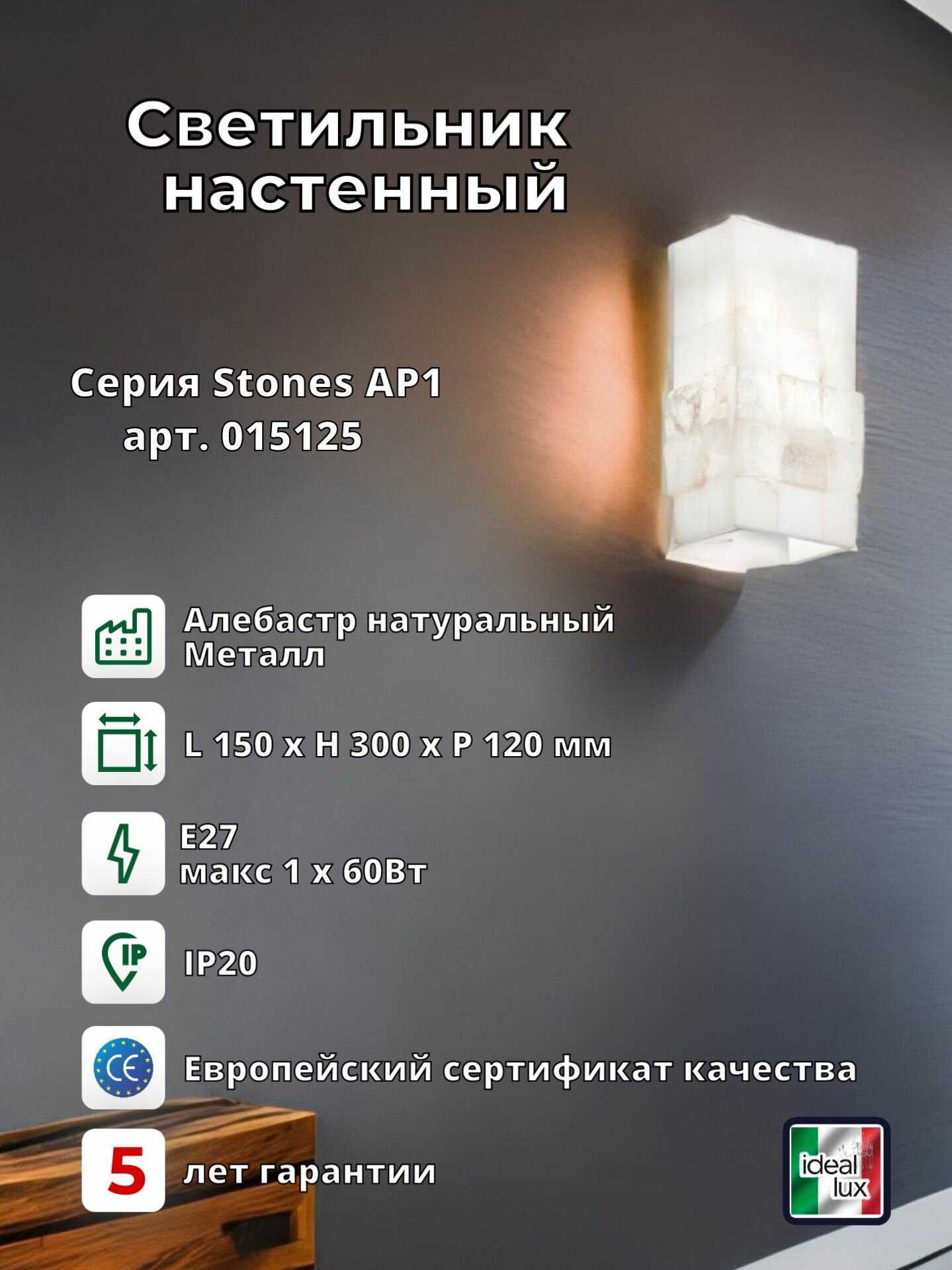 Настенный светильник Stones AP1 - продукт известной компании Ideal Lux (Италия). Имеет максимальную мощность 60 Вт, освещает площадь до 3 кв. м. Отлично подойдет для таких мест, как прихожая и коридор, кабинет. Впишется в интерьеры следующих стилей: модерн.