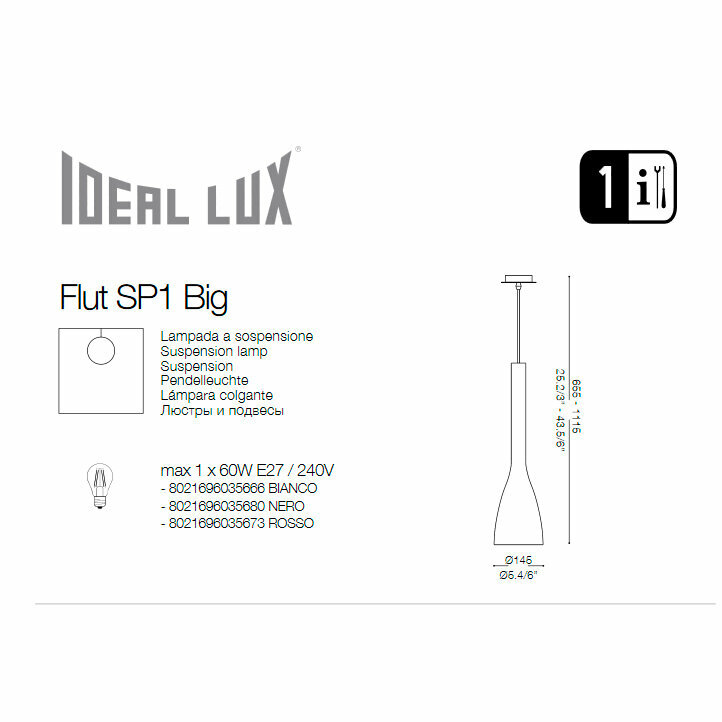 Подвесной светильник Flut SP1 BIG NERO - продукт известной компании Ideal Lux (Италия). Имеет максимальную мощность 60 Вт, освещает площадь до 3 кв. м. Отлично подойдет для таких мест, как гостиная, прихожая и коридор, кафе, холл, спальня, кухня, над обеденным столом, над кухонным островом. Впишется в интерьеры следующих стилей: минимализм.