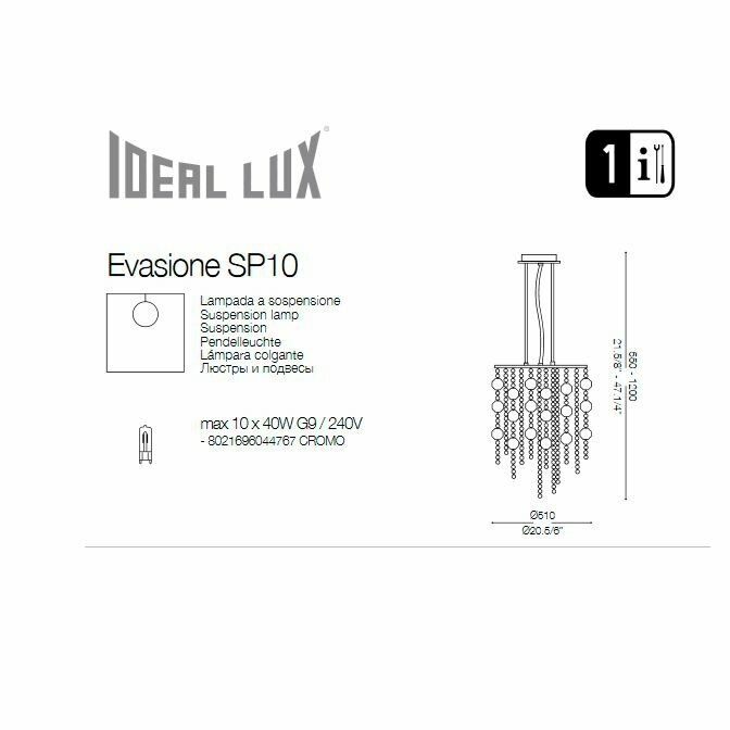 Подвесной светильник Evasione SP8 - продукт известной компании Ideal Lux (Италия). Имеет максимальную мощность 320 Вт, освещает площадь до 23 кв. м. Отлично подойдет для таких мест, как кухня, кафе. Впишется в интерьеры следующих стилей: модерн.