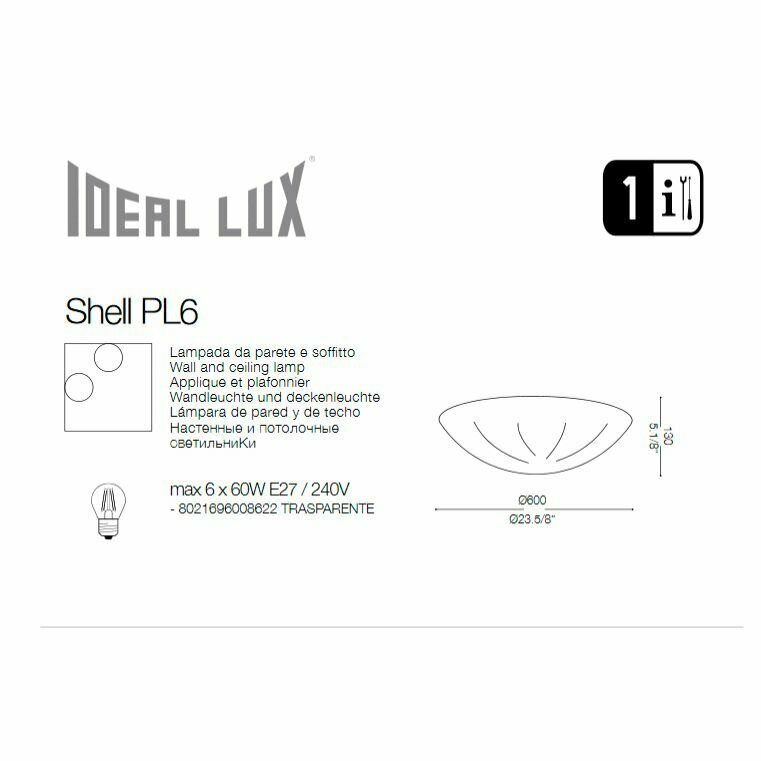 Потолочный светильник Shell PL6 TRASPARENTE - продукт известной компании Ideal Lux (Италия). Имеет максимальную мощность 360 Вт, освещает площадь до 18 кв. м. Отлично подойдет для таких мест, как гостиная, спальня, холл, прихожая и коридор, кафе. Впишется в интерьеры следующих стилей: модерн.