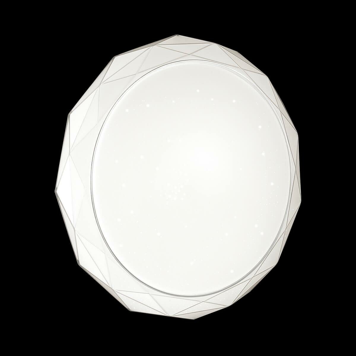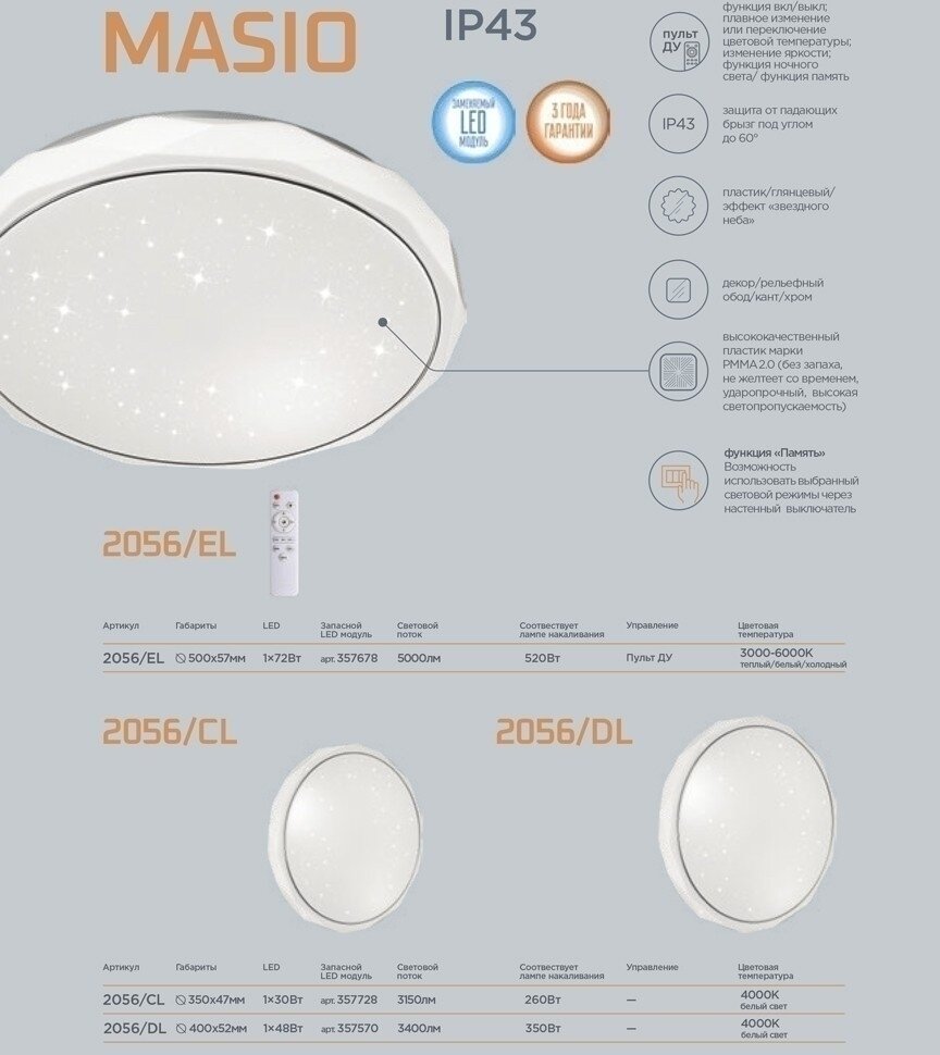 Светильник 2056/EL серии MASIO cостоит из металлического основания (базы) и пластикового рассевателя. Материал рассеивателя - высококачественный акрил белого цвета с глянцевой поверхностью, обеспечивающий светильнику равномерное рассеивание и хорошее светопропускание. Форма плафона: круглая, декорирована ободом с объемной структурой, кантом цвета хром, а также прозрачными точками, придающими включенному светильнику красивый эффект "звездного мерцания" и переливания. Степень защиты IP43 позволяет использовать светильник в определенных зонах влажных помещений. В комплект входит заменяемый LED модуль с линзами, мощностью 72Вт, которая соответствует лампе накаливания 520Вт. А также пульт ДУ, с помощью которого осуществляется плавное изменение цветовой температуры 3000-6000К, изменение яркости, переход в режим переключения теплого/белого/холодного/ночного света.